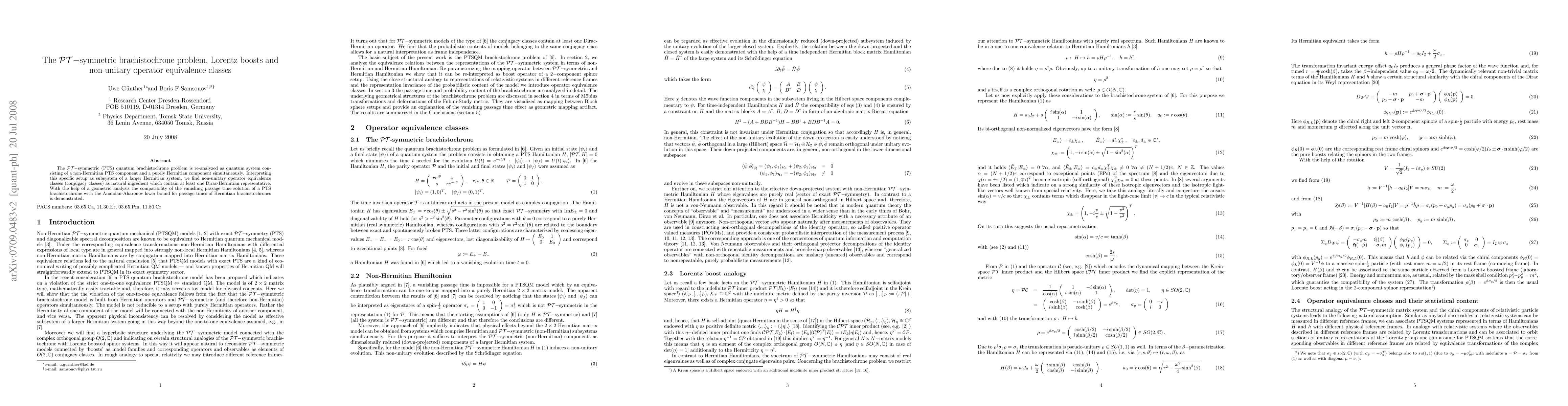 The PT-symmetric (PTS) quantum brachistochrone problem is reanalyzed as quantum system consisting of a non-Hermitian PTS component and a purely Hermitian component simultaneously. Interpreting this specific setup as subsystem of a larger Hermitian system, we find non-unitary operator equivalence classes (conjugacy classes) as natural ingredient which contain at least one Dirac-Hermitian representative. With the help of a geometric analysis the compatibility of the vanishing passage time solution of a PTS brachistochrone with the Anandan-Aharonov lower bound for passage times of Hermitian brachistochrones is demonstrated.