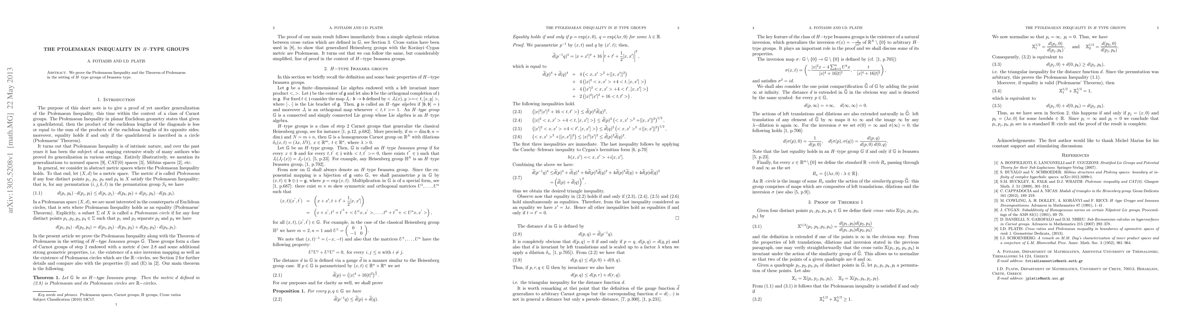 Summary: This paper establishes the Ptolemaean Inequality and proves the Theorem of Ptolemaeus within the mathematical framework of $H$--type groups of Iwasawa--type. The findings extend classical geometric results to a non-Euclidean setting.