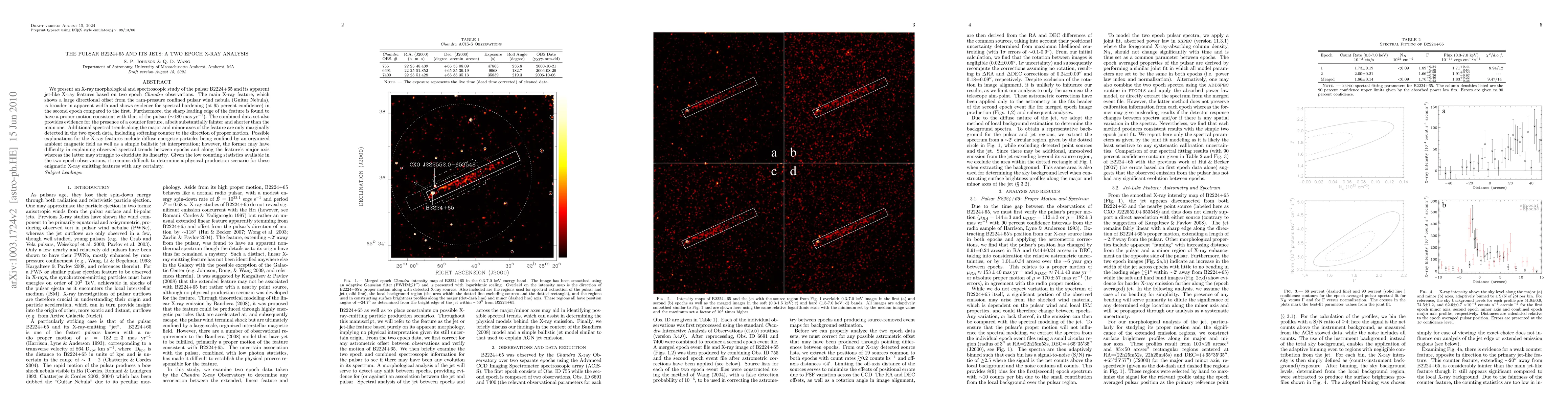 We present an X-ray morphological and spectroscopic study of the pulsar B2224+65 and its apparent jet-like X-ray features based on two epoch Chandra observations. The main X-ray feature, which shows a large directional offset from the ram-pressure confined pulsar wind nebula (Guitar Nebula), is broader in apparent width and shows evidence for spectral hardening (at 95 percent confidence) in the second epoch compared to the first. Furthermore, the sharp leading edge of the feature is found to have a proper motion consistent with that of the pulsar (~180 mas yr-1). The combined data set also provides evidence for the presence of a counter feature, albeit substantially fainter and shorter than the main one. Additional spectral trends along the major and minor axes of the feature are only marginally detected in the two epoch data, including softening counter to the direction of proper motion. Possible explanations for the X-ray features include diffuse energetic particles being confined by an organized ambient magnetic field as well as a simple ballistic jet interpretation; however, the former may have difficulty in explaining observed spectral trends between epochs and along the feature's major axis whereas the latter may struggle to elucidate its linearity. Given the low counting statistics available in the two epoch observations, it remains difficult to determine a physical production scenario for these enigmatic X-ray emitting features with any certainty.