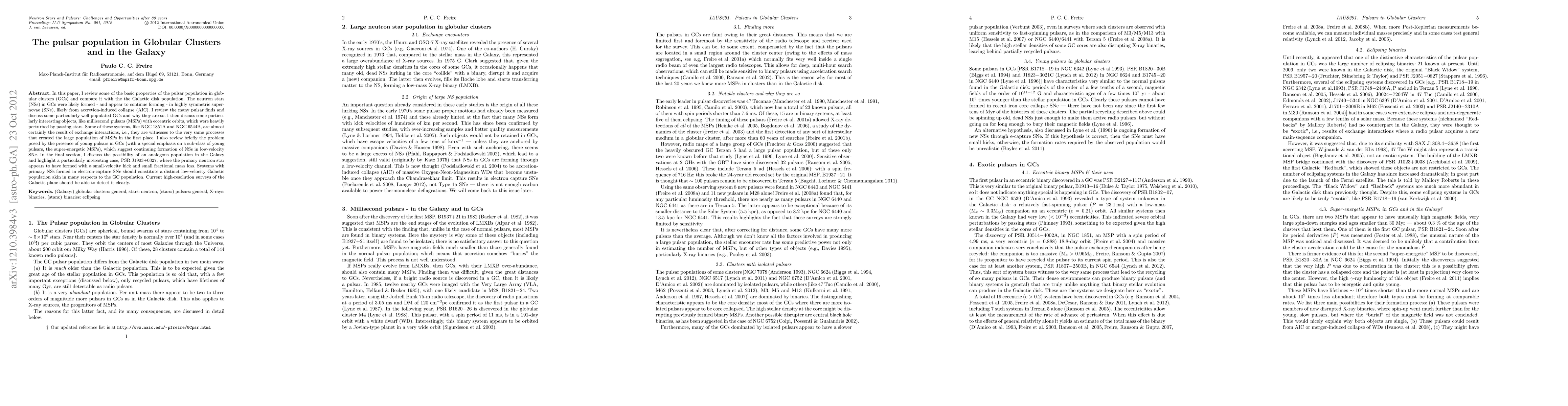 In this paper, I review some of the basic properties of the pulsar population in globular clusters (GCs) and compare it with the the Galactic disk population. The neutron stars (NSs) in GCs were likely formed - and appear to continue forming - in highly symmetric supernovae (SNe), likely from accretion-induced collapse (AIC). I review the many pulsar finds and discuss some particularly well populated GCs and why they are so. I then discuss some particularly interesting objects, like millisecond pulsars (MSPs) with eccentric orbits, which were heavily perturbed by passing stars. Some of these systems, like NGC 1851A and NGC 6544B, are almost certainly the result of exchange interactions, i.e., they are witnesses to the very same processes that created the large population of MSPs in the first place. I also review briefly the problem posed by the presence of young pulsars in GCs (with a special emphasis on a sub-class of young pulsars, the super-energetic MSPs), which suggest continuing formation of NSs in low-velocity SNe. In the final section, I discuss the possibility of an analogous population in the Galaxy and highlight a particularly interesting case, PSR J1903+0327, where the primary neutron star appears to have formed with a small-velocity kick and small fractional mass loss. Systems with primary NSs formed in electron-capture SNe should constitute a distinct low-velocity Galactic population akin in many respects to the GC population. Current high-resolution surveys of the Galactic plane should be able to detect it clearly.