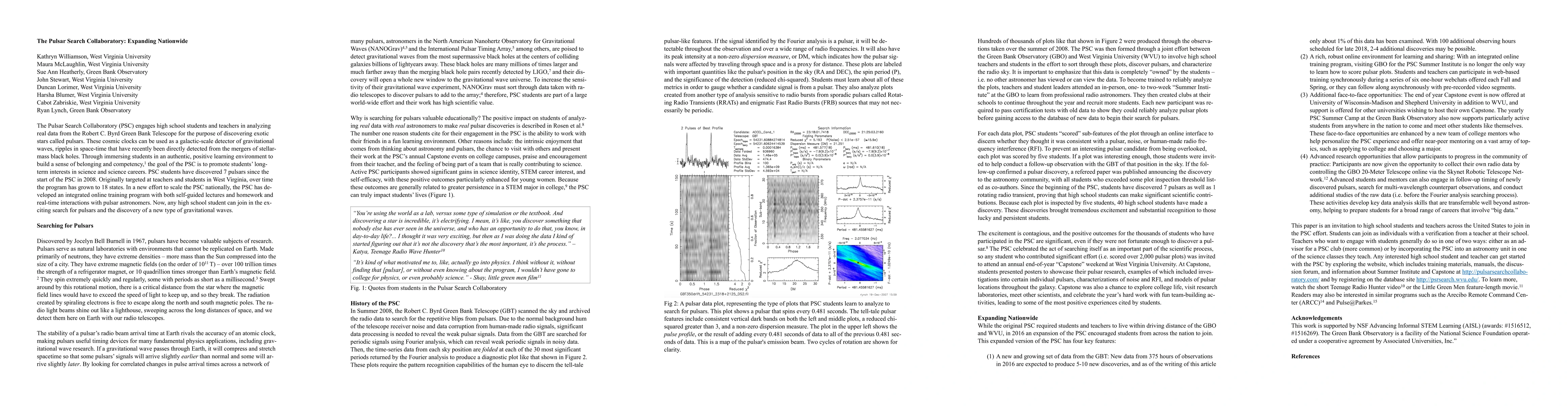 The Pulsar Search Collaboratory (PSC) engages high school students and teachers in analyzing telescope data to discover pulsars, fostering long-term science interest. The program has expanded from West Virginia to 18 states, now scaling nationally with an online training program to involve students nationwide.