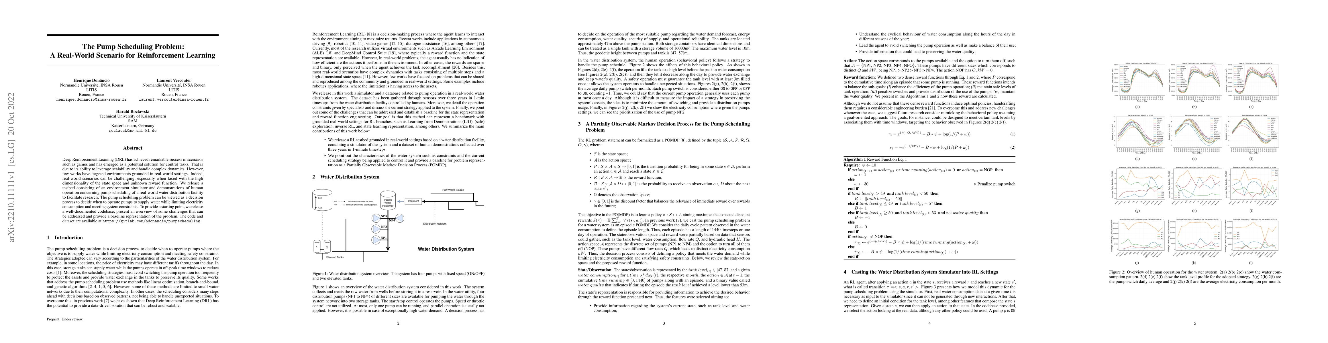 Deep Reinforcement Learning (DRL) has achieved remarkable success in scenarios such as games and has emerged as a potential solution for control tasks. That is due to its ability to leverage scalability and handle complex dynamics. However, few works have targeted environments grounded in real-world settings. Indeed, real-world scenarios can be challenging, especially when faced with the high dimensionality of the state space and unknown reward function. We release a testbed consisting of an environment simulator and demonstrations of human operation concerning pump scheduling of a real-world water distribution facility to facilitate research. The pump scheduling problem can be viewed as a decision process to decide when to operate pumps to supply water while limiting electricity consumption and meeting system constraints. To provide a starting point, we release a well-documented codebase, present an overview of some challenges that can be addressed and provide a baseline representation of the problem. The code and dataset are available at https://gitlab.com/hdonancio/pumpscheduling.