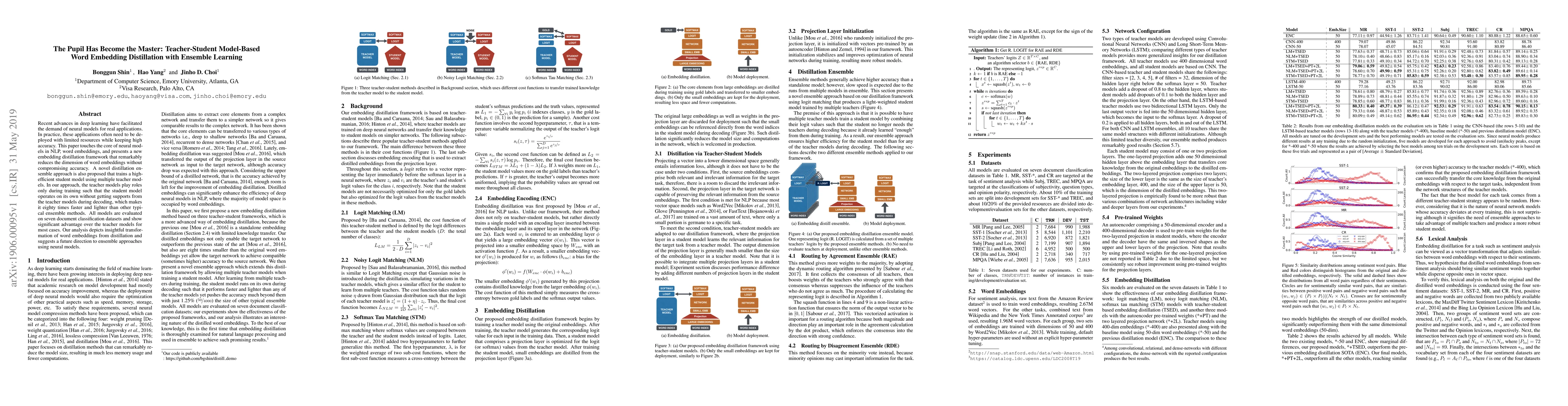 This paper introduces a novel word embedding distillation framework that significantly reduces the size of word embeddings while maintaining accuracy, employing an ensemble learning approach to train a highly efficient student model. The student model, trained with multiple teacher models, operates independently during decoding, resulting in a model that is eighty times faster and lighter, demonstrating superior performance on document classification datasets.