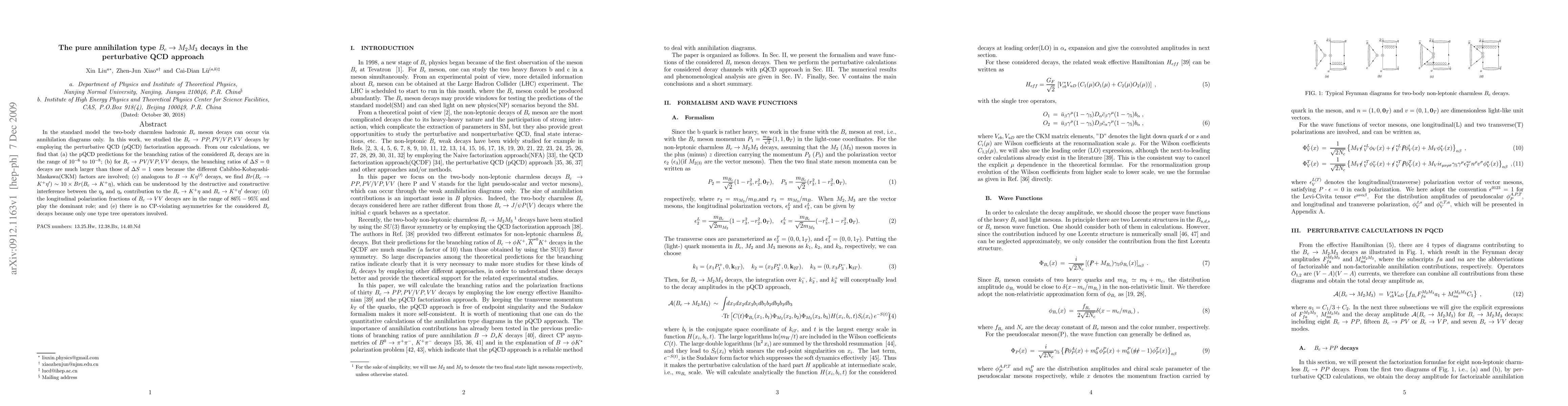 In the standard model the two-body charmless hadronic $B_c$ meson decays can occur via annihilation diagrams only. In this work, we studied the $B_c \to PP, PV/VP,VV$ decays by employing the perturbative QCD (pQCD) factorization approach. From our calculations, we find that (a) the pQCD predictions for the branching ratios of the considered $B_c$ decays are in the range of $10^{-6}$ to $10^{-8}$; (b) for $B_c \to PV/VP, VV$ decays, the branching ratios of $\Delta S= 0$ decays are much larger than those of $\Delta S =1$ ones because the different Cabibbo-Kobayashi-Maskawa(CKM) factors are involved; (c) analogous to $B \to K \eta^{(\prime)}$ decays, we find $Br(B_c \to K^+ \eta^\prime) \sim 10 \times Br(B_c \to K^+ \eta)$, which can be understood by the destructive and constructive interference between the $\eta_q$ and $\eta_s$ contribution to the $B_c \to K^+ \eta$ and $B_c \to K^+ \eta^\prime$ decay; (d) the longitudinal polarization fractions of $B_c \to VV$ decays are in the range of $86%-95%$ and play the dominant role; and (e) there is no CP-violating asymmetries for the considered $B_c$ decays because only one type tree operators involved.