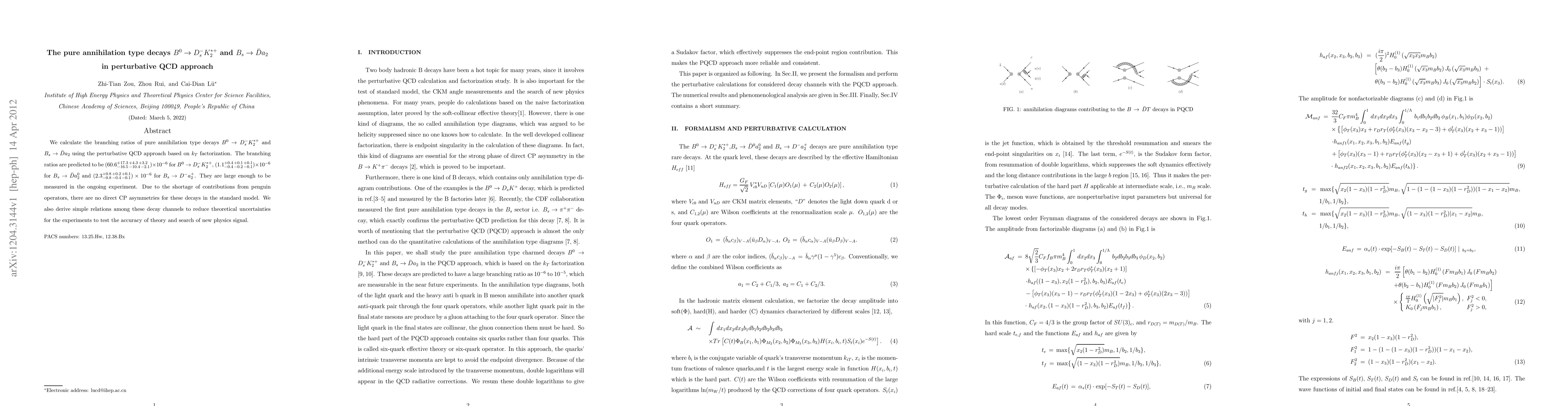 We calculate the branching ratios of pure annihilation type decays $B^0\rightarrow D_{s}^{-}K_{2}^{*+}$ and $B_s\rightarrow \bar{D}a_{2}$ using the perturbative QCD approach based on $k_T$ factorization. The branching ratios are predicted to be $(60.6_{-16.5\,-10.4\,-2.1}^{+17.3\,+4.3\,+3.2}) \times 10^{-6}$ for $B^0\rightarrow D_{s}^{-}K_{2}^{*+}$, $(1.1_{-0.4\,-0.2\,-0.1}^{+0.4\,+0.1\,+0.1})\times 10^{-6}$ for $B_s\rightarrow \bar{D}a_{2}^{0}$ and $(2.3_{-0.8\,-0.4\,-0.1}^{+0.8\,+0.2\,+0.1})\times 10^{-6}$ for $B_{s}\rightarrow D^{-}a_{2}^{+}$. They are large enough to be measured in the ongoing experiment. Due to the shortage of contributions from penguin operators, there are no direct CP asymmetries for these decays in the standard model. We also derive simple relations among these decay channels to reduce theoretical uncertainties for the experiments to test the accuracy of theory and search of new physics signal.