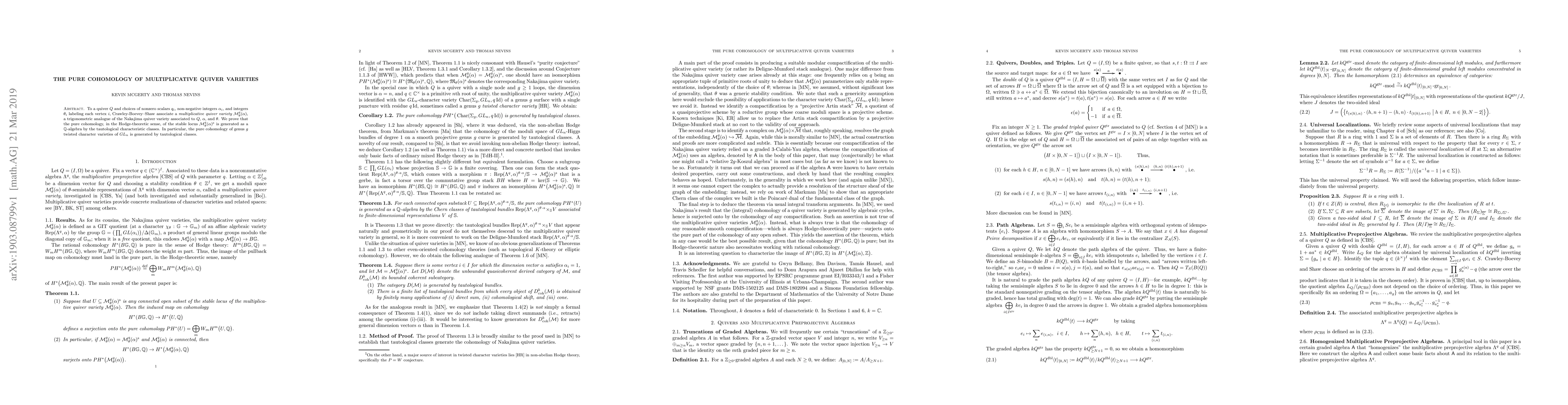Researchers prove that the pure cohomology of multiplicative quiver varieties is generated by tautological characteristic classes, with implications for twisted character varieties of GLn.
