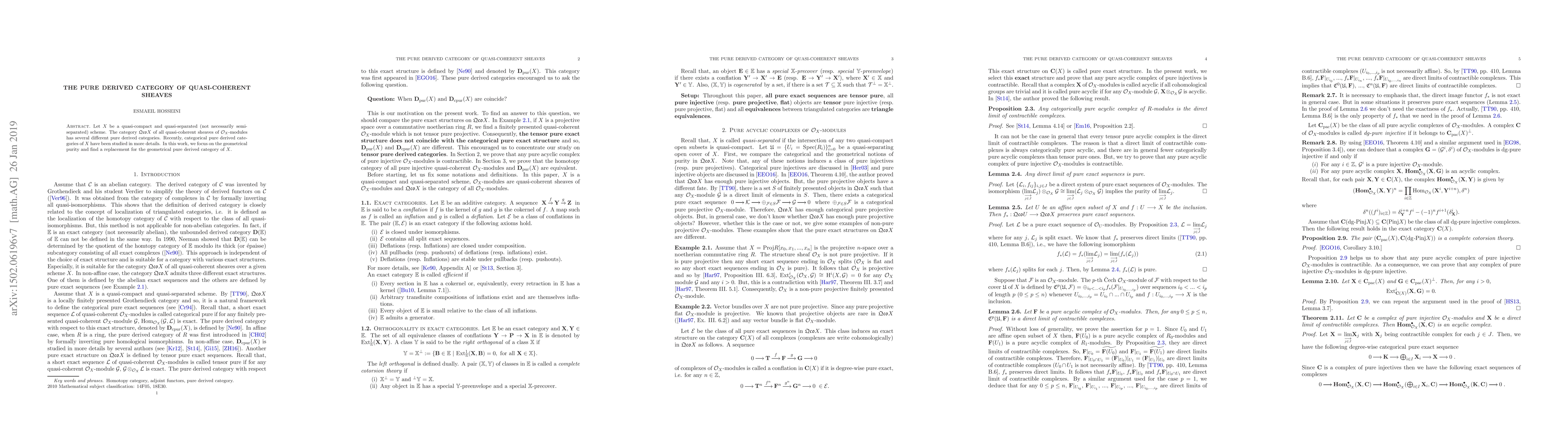 The paper introduces and analyzes the pure derived category of quasi-coherent sheaves, proving key results about pure acyclic complexes and dg-pure injective complexes, and establishing an equivalence with the pure derived category.