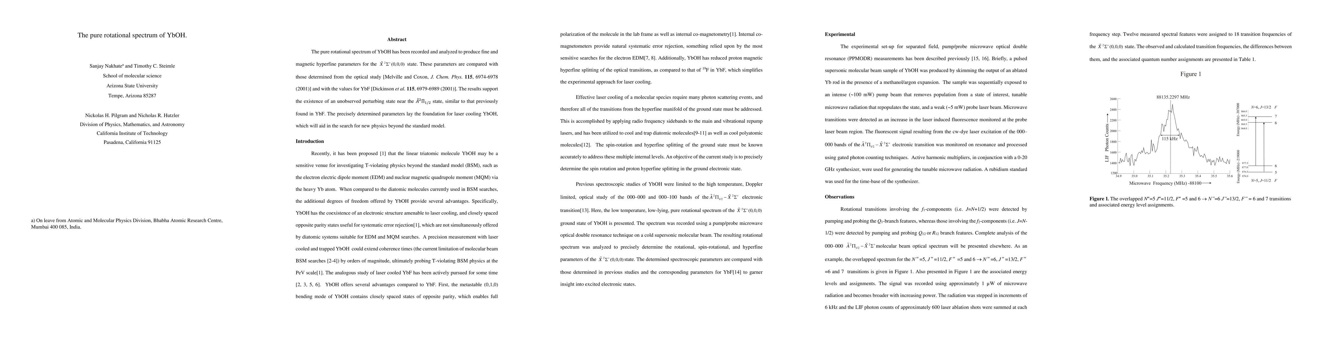 Researchers have analyzed the pure rotational spectrum of YbOH to determine fine and magnetic hyperfine parameters, finding evidence for an unobserved perturbing state that could aid in laser cooling and search for new physics.