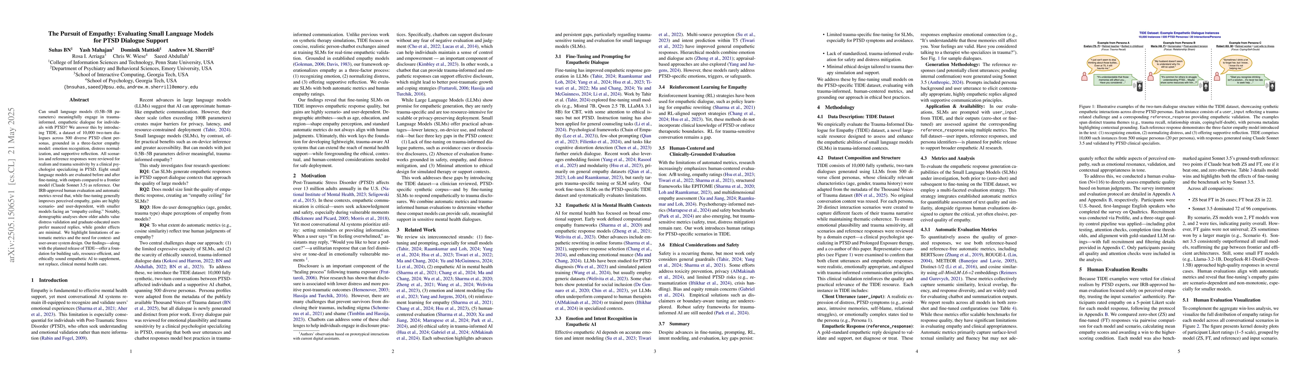 This work differentiates itself by focusing on small language models, employing a three-factor empathy model, and providing a dataset (TIDE) for empathetic dialogue evaluation in PTSD support.