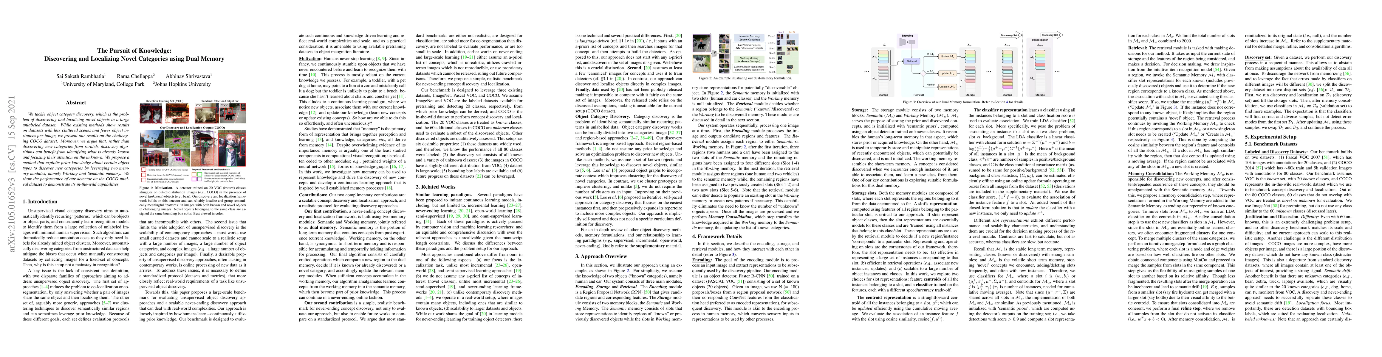 This paper proposes a method for discovering and localizing novel object categories in large, unlabeled datasets using dual memory modules—Working and Semantic memory. It demonstrates improved performance on the COCO dataset compared to existing methods, leveraging prior knowledge to focus on unknown categories.