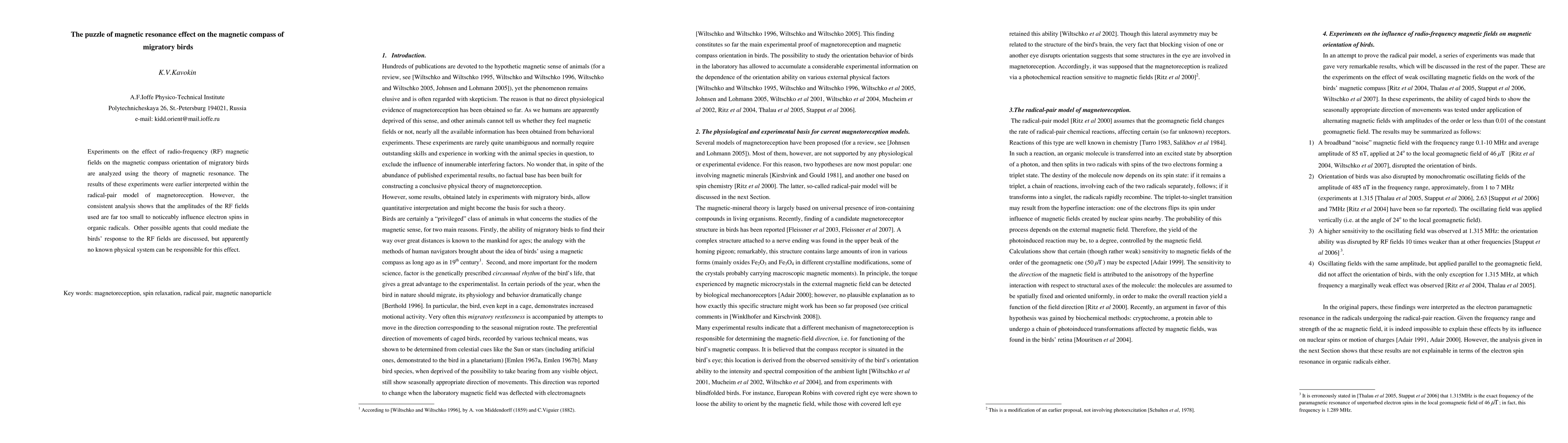 This paper investigates the impact of radio-frequency magnetic fields on migratory birds' magnetic compass orientation, finding that the field amplitudes are too weak to affect electron spins in organic radicals. The study concludes that no known physical system can account for the observed effect.