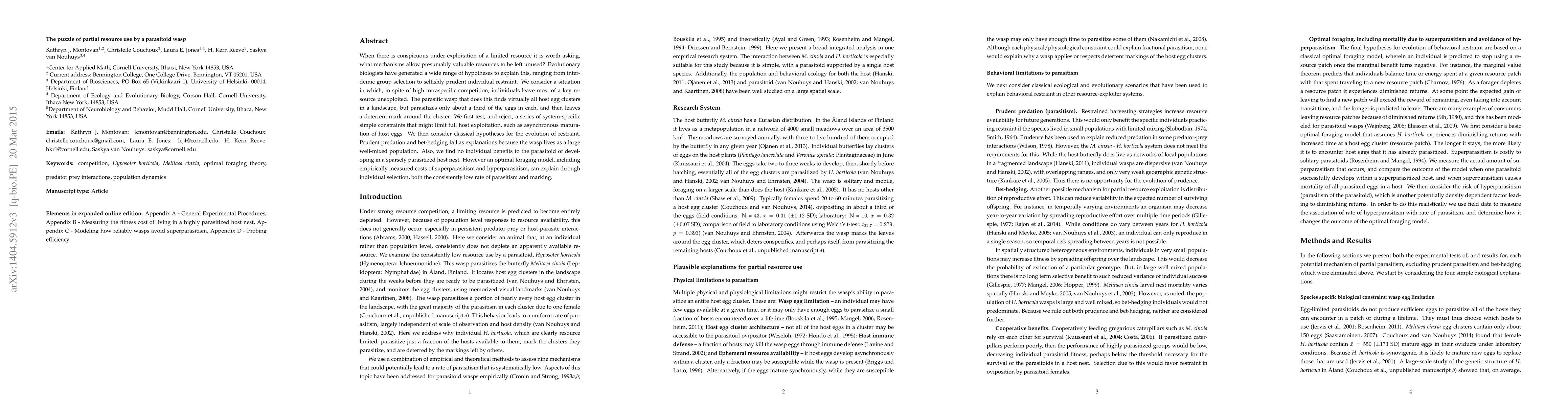 When there is conspicuous under-exploitation of a limited resource, it is worth asking what mechanisms allow presumably valuable resources to be left unused? Evolutionary biologists have generated a wide range of hypotheses to explain this, ranging from interdemic group selection to selfishly prudent individual restraint. We consider a situation in which, in spite of high intraspecific competition, individuals leave most of a key resource unexploited. The parasitic wasp that does this finds virtually all host egg clusters in a landscape, but parasitizes only about a third of the eggs in each, and then leaves a deterrent mark around the cluster. We first test, and reject, a series of system-specific simple constraints that might limit full host exploitation, such as asynchronous maturation of host eggs. We then consider classical hypotheses for the evolution of restraint. Prudent predation and bet-hedging fail as explanations because the wasp lives as a large well-mixed population. Also, we find no individual benefits to the parasitoid of developing in a sparsely parasitized host nest. However an optimal foraging model, including empirically measured costs of superparasitism and hyperparasitism, can explain through individual selection, both the consistently low rate of parasitism and marking.
