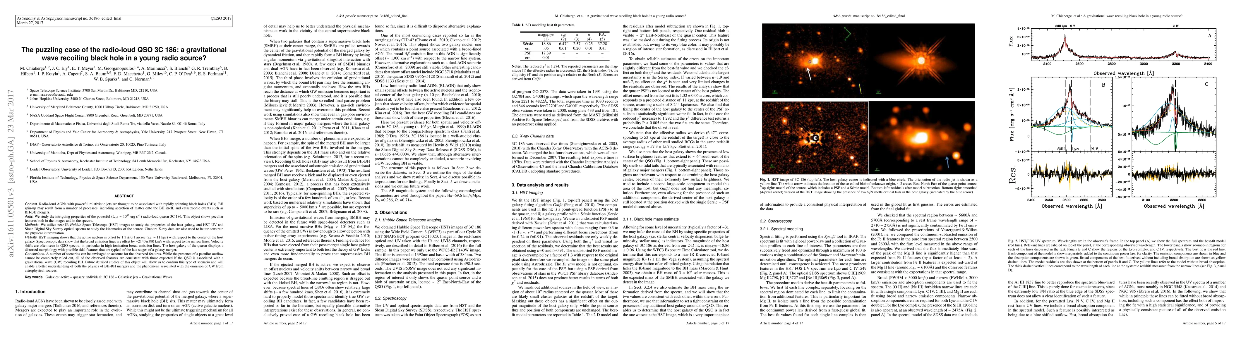 The paper investigates the peculiar radio-loud quasar 3C 186, finding its active nucleus is offset from the host galaxy center, suggesting a gravitational wave recoiling black hole. Future studies may confirm this scenario and enhance our understanding of black hole mergers and gravitational wave emissions.