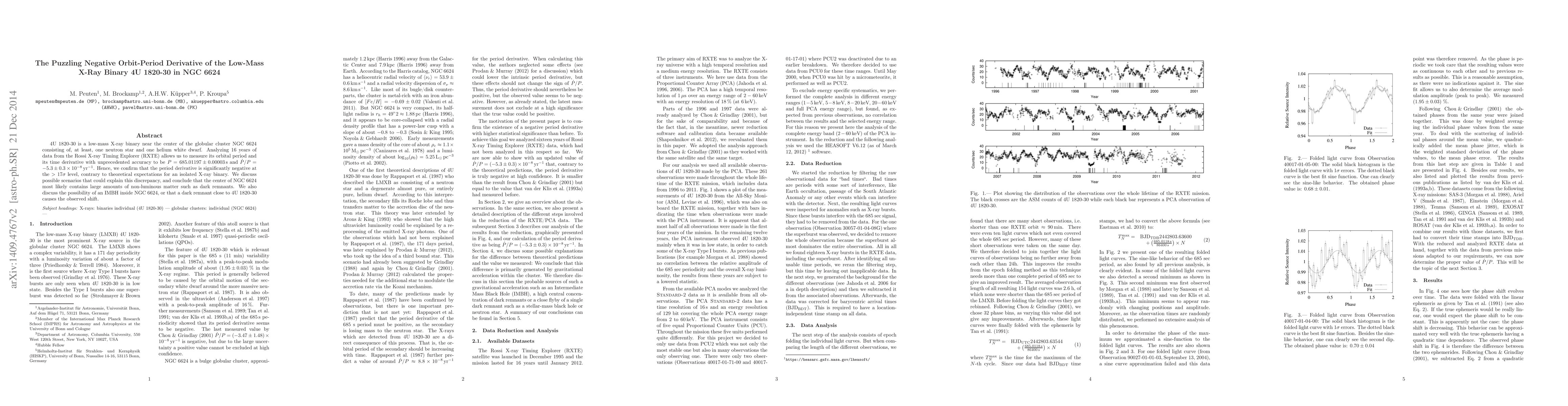 This paper reports a significantly negative orbital period derivative for the low-mass X-ray binary 4U 1820-30 in NGC 6624, contrary to theoretical predictions, suggesting the presence of non-luminous matter or an intermediate-mass black hole in the cluster. The findings challenge existing models and propose dark remnants as a plausible explanation.