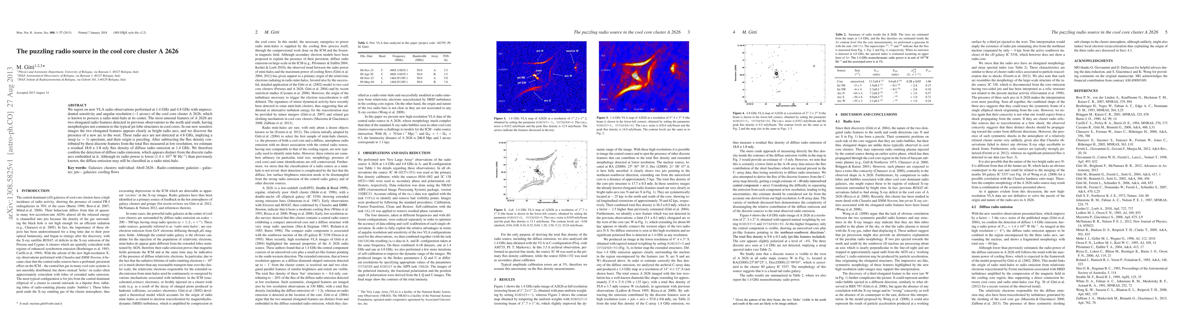 We report on new VLA radio observations performed at 1.4 GHz and 4.8 GHz with unprecedented sensitivity and angular resolution (~1 arcsec) of the cool core cluster A 2626, which is known to possess a radio mini-halo at its center. The most unusual features of A 2626 are two elongated radio features detected in previous observations to the north and south, having morphologies not common to the typical jet-lobe structures in cool cores. In our new sensitive images the two elongated features appears clearly as bright radio arcs, and we discover the presence of a new arc to the west. These radio arcs are not detected at 4.8 GHz, implying a steep (alpha >1) spectrum, and their origin is puzzling. After subtracting the flux density contributed by these discrete features from the total flux measured at low resolution, we estimate a residual 18.0 +/- 1.8 mJy flux density of diffuse radio emission at 1.4 GHz. We therefore confirm the detection of diffuse radio emission, which appears distinct from the discrete radio arcs embedded in it. Although its radio power is lower (1.4x10^23 W/Hz) than previously known, the diffuse emission may still be classified as a radio mini-halo.