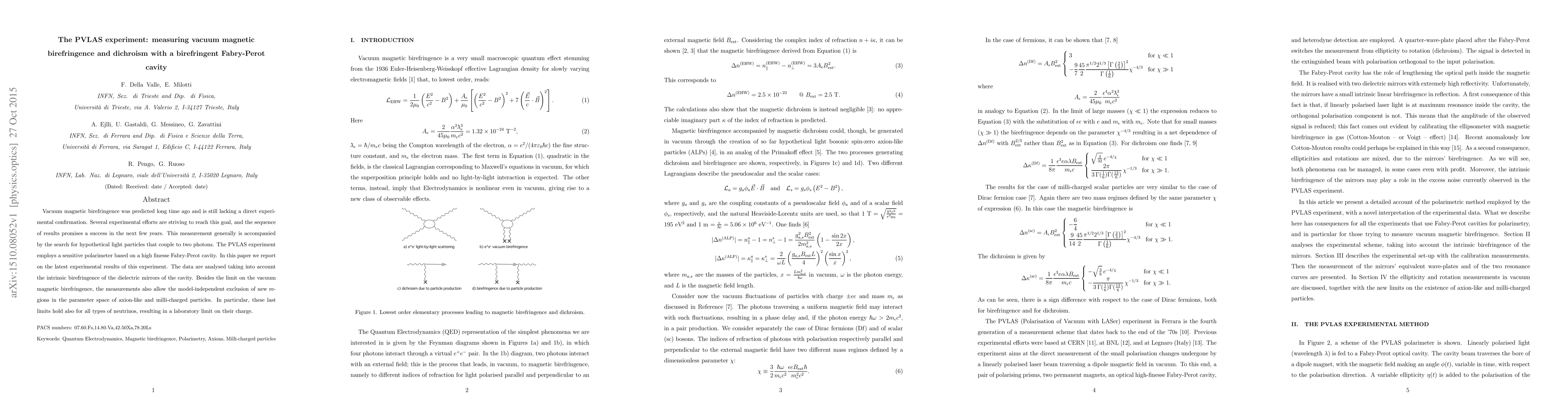 The PVLAS experiment uses a high finesse Fabry-Perot cavity to measure vacuum magnetic birefringence and dichroism, providing new limits on axion-like and milli-charged particles, including a laboratory limit on neutrino charge. The results also exclude new regions in the parameter space for these hypothetical particles.