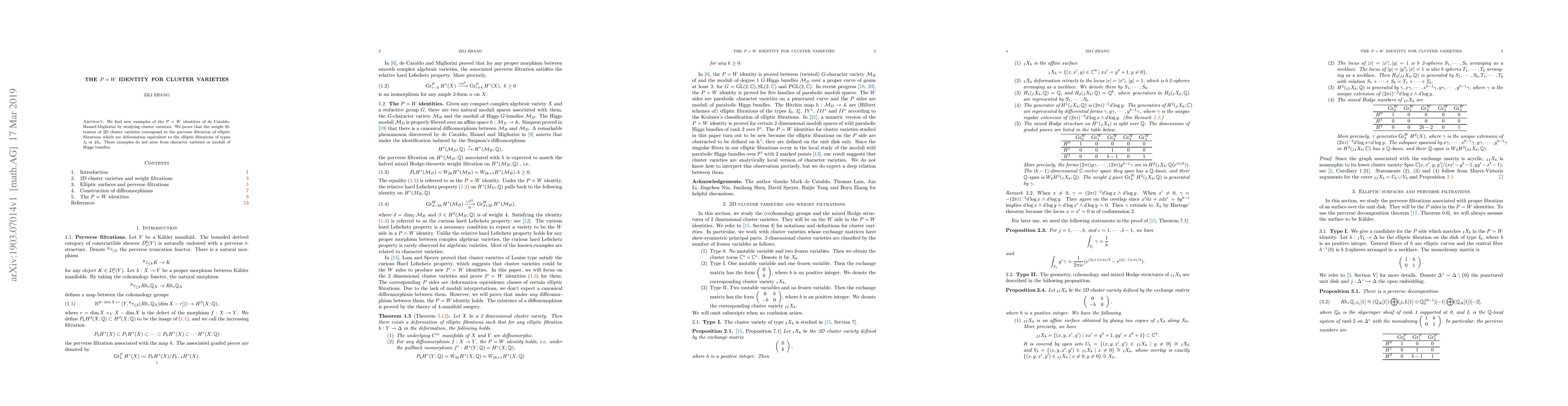 The paper demonstrates the $P=W$ identity in the context of 2D cluster varieties, showing that their weight filtration aligns with the perverse filtration of specific elliptic fibrations. These examples are unique and do not stem from character varieties or moduli of Higgs bundles.
