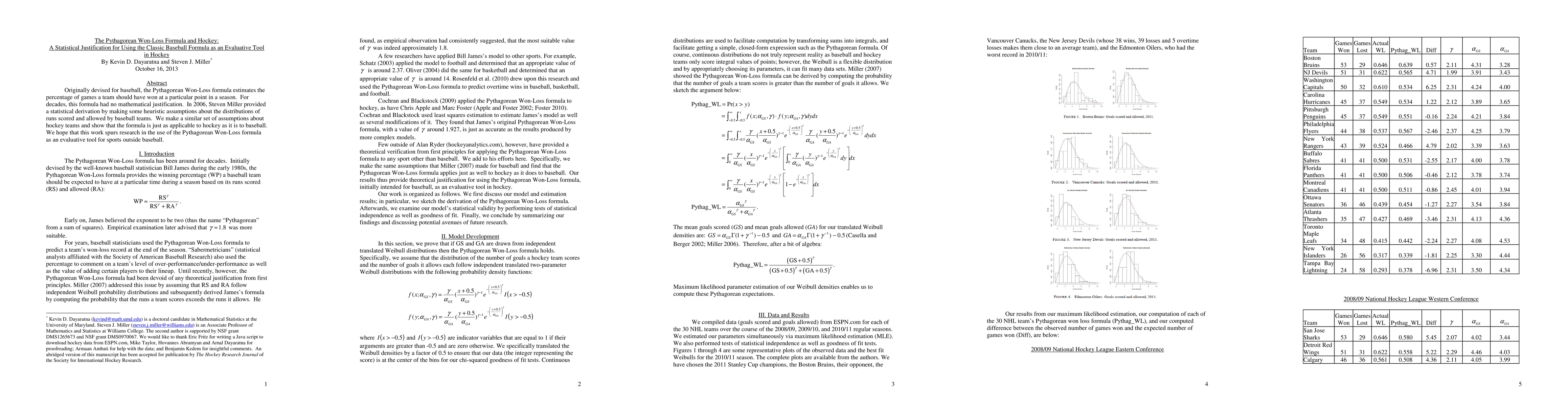 Originally devised for baseball, the Pythagorean Won-Loss formula estimates the percentage of games a team should have won at a particular point in a season. For decades, this formula had no mathematical justification. In 2006, Steven Miller provided a statistical derivation by making some heuristic assumptions about the distributions of runs scored and allowed by baseball teams. We make a similar set of assumptions about hockey teams and show that the formula is just as applicable to hockey as it is to baseball. We hope that this work spurs research in the use of the Pythagorean Won-Loss formula as an evaluative tool for sports outside baseball.
