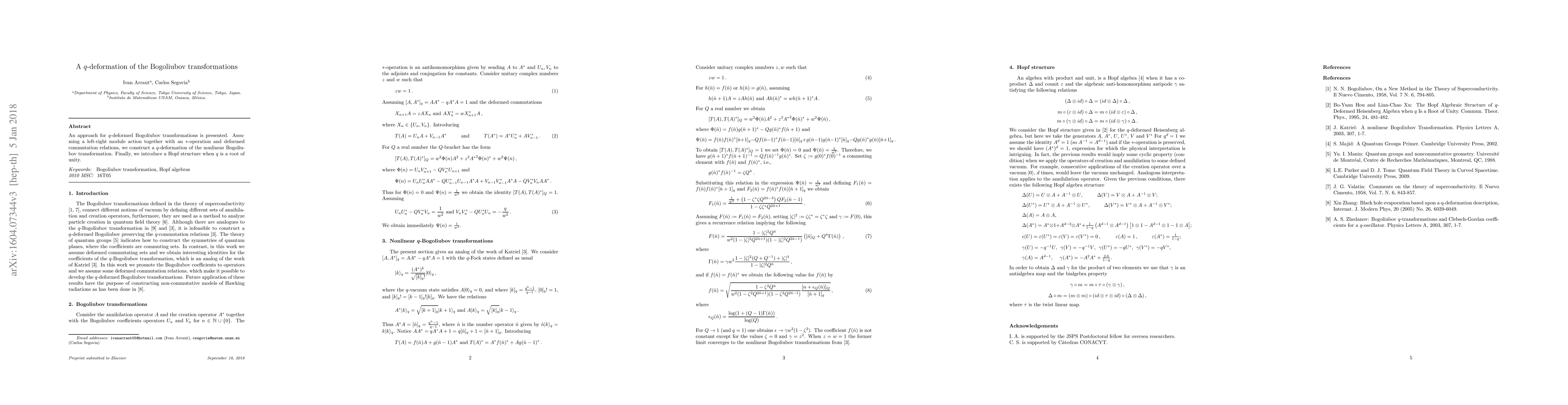 The paper introduces a $q$-deformed Bogoliubov transformation and extends it to a Hopf algebra structure, providing a general result applicable in Quantum Field Theory.