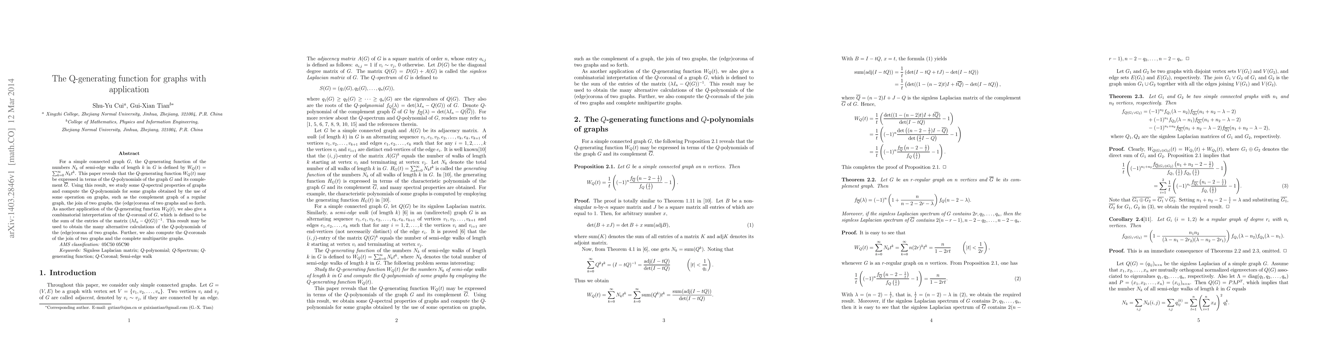 For a simple connected graph $G$, the $Q$-generating function of the numbers $N_k$ of semi-edge walks of length $k$ in $G$ is defined by $W_Q(t)=\sum\nolimits_{k = 0}^\infty {N_k t^k }$. This paper reveals that the $Q$-generating function $W_Q(t)$ may be expressed in terms of the $Q$-polynomials of the graph $G$ and its complement $\overline{G}$. Using this result, we study some $Q$-spectral properties of graphs and compute the $Q$-polynomials for some graphs obtained by the use of some operation on graphs, such as the complement graph of a regular graph, the join of two graphs, the (edge)corona of two graphs and so forth. As another application of the $Q$-generating function $W_Q(t)$, we also give a combinatorial interpretation of the $Q$-coronal of $G$, which is defined to be the sum of the entries of the matrix $(\lambda I_n-Q(G))^{-1}$. This result may be used to obtain the many alternative calculations of the $Q$-polynomials of the (edge)corona of two graphs. Further, we also compute the $Q$-coronals of the join of two graphs and the complete multipartite graphs.