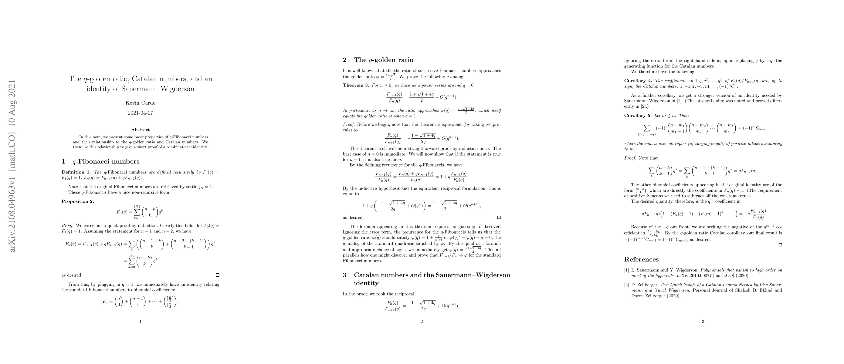 Summary: This paper explores the properties of $q$-Fibonacci numbers and their connections to the $q$-golden ratio and Catalan numbers, ultimately providing a concise proof of a Sauermann--Wigderson combinatorial identity.