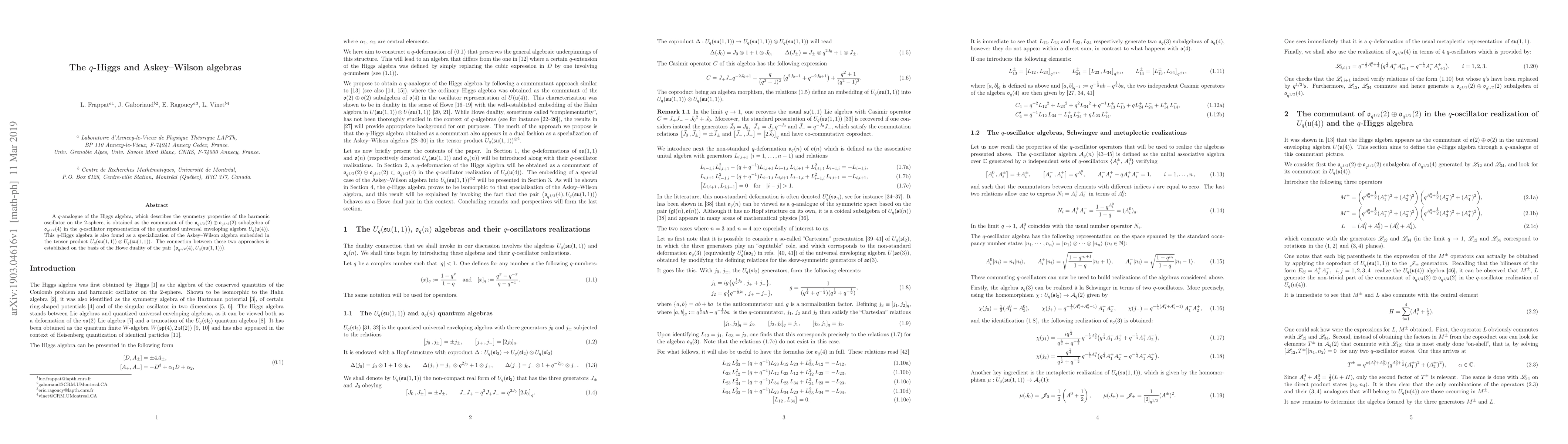 The paper presents a comprehensive analysis of the $q$-Higgs algebra, demonstrating its equivalence to both the commutant of a subalgebra in $U_q(\mathfrak{u}(4))$ and a specialization of the Askey-Wilson algebra, thereby extending the understanding of $q$-deformed symmetries.