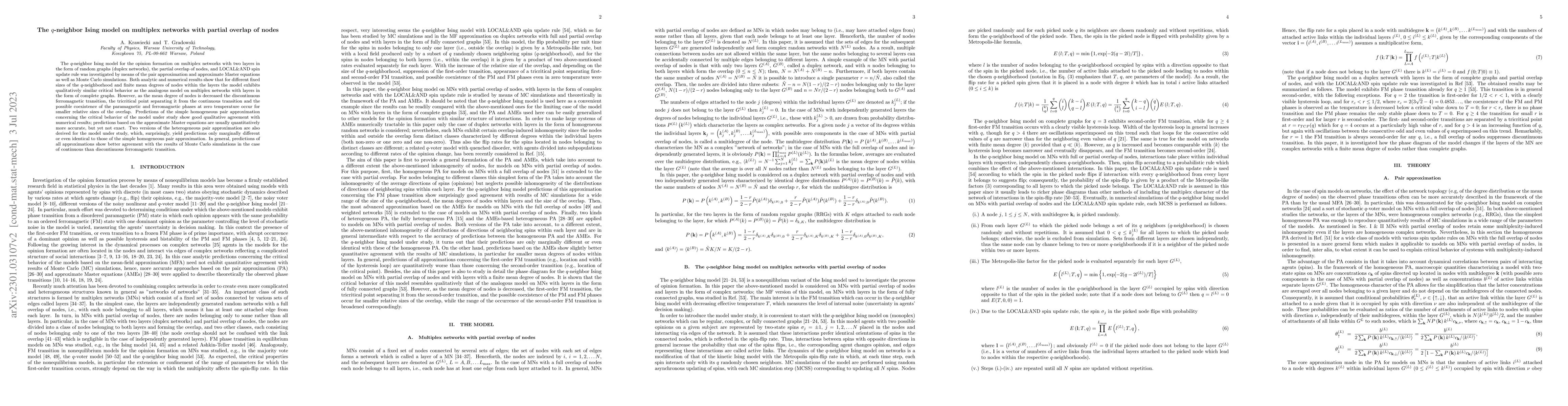 This paper investigates the $q$-neighbor Ising model on duplex networks with partial node overlap, using pair approximation, Master equations, and Monte Carlo simulations. The study finds similar critical behavior to models on complete graph layers, but with reduced mean degrees, transitions occur at smaller overlap sizes. The homogeneous pair approximation aligns well with numerical results, while the Master equations provide more accurate but not exact predictions.