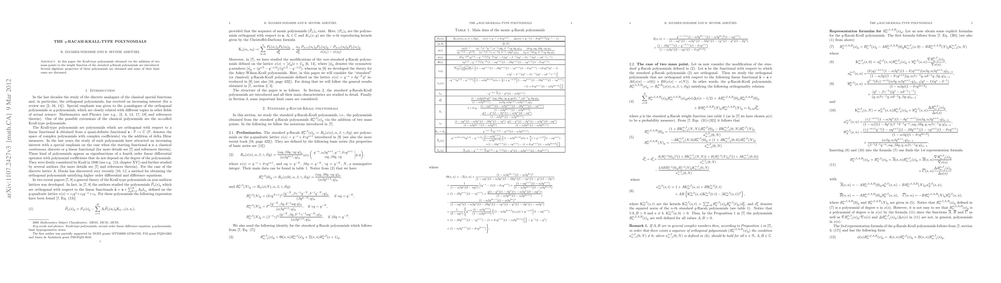 In this paper the Krall-type polynomials obtained via the addition of two mass points to the weight function of the \textit{standard} $q$-Racah polynomials are introduced. Several algebraic properties of these polynomials are obtained and some of their limit cases are discussed.