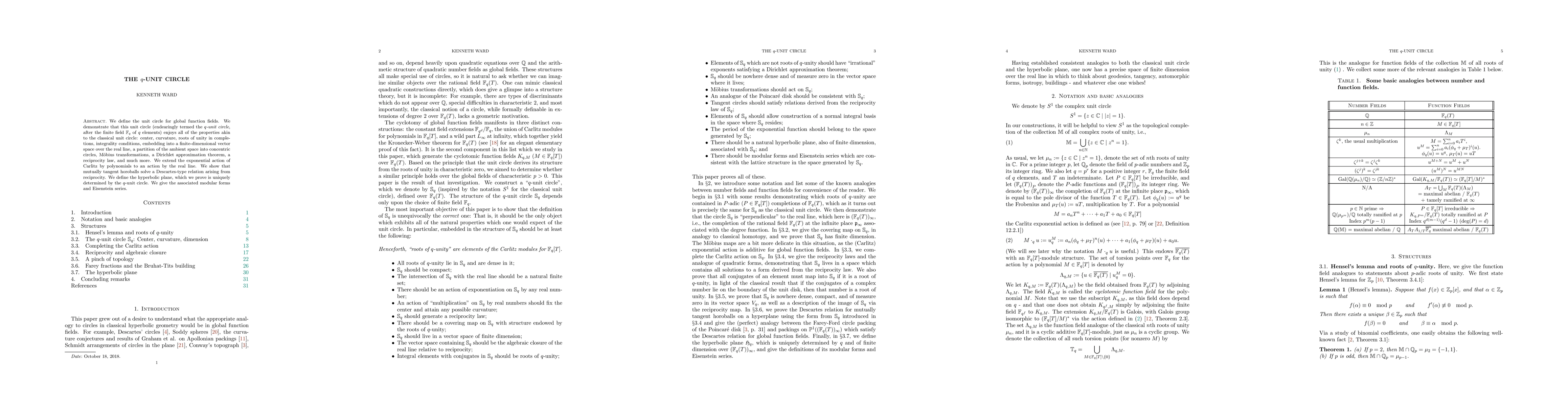 We define the unit circle for global function fields. We demonstrate that this unit circle (endearingly termed the \emph{$q$-unit circle}, after the finite field $\mathbb{F}_q$ of $q$ elements) enjoys all of the properties akin to the classical unit circle: center, curvature, roots of unity in completions, integrality conditions, embedding into a finite-dimensional vector space over the real line, a partition of the ambient space into concentric circles, M\"{o}bius transformations, a Dirichlet approximation theorem, a reciprocity law, and much more. We extend the exponential action of Carlitz by polynomials to an action by the real line. We show that mutually tangent horoballs solve a Descartes-type relation arising from reciprocity. We define the hyperbolic plane, which we prove is uniquely determined by the $q$-unit circle. We give the associated modular forms and Eisenstein series.