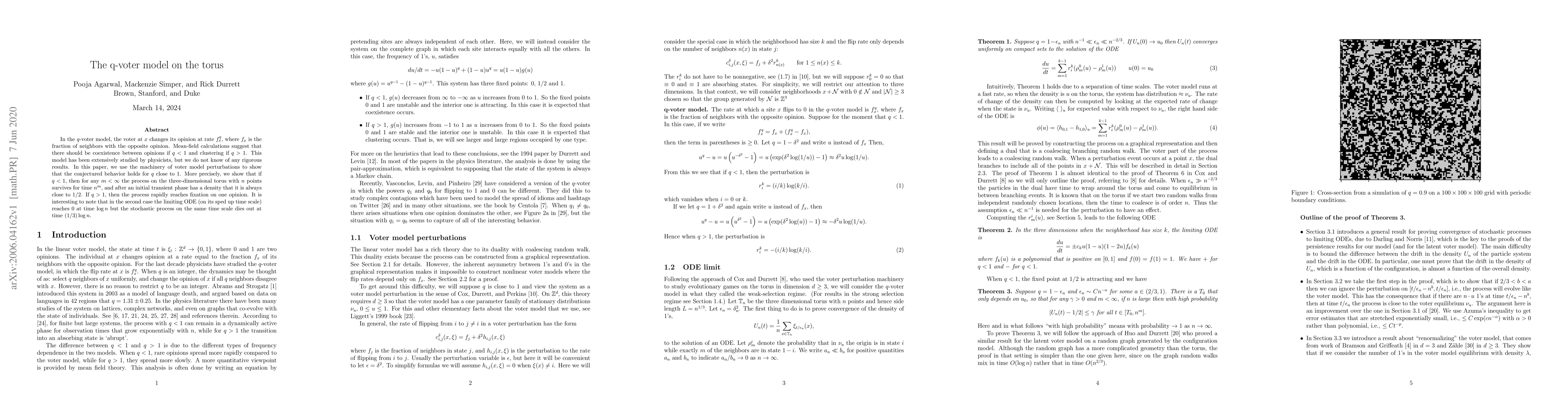 This paper rigorously proves the conjectured behavior of the $q$-voter model on the torus: for $q<1$, the model exhibits coexistence with a density close to 1/2, while for $q>1$, the model rapidly fixes on a single opinion. The study uses voter model perturbations to demonstrate these results.