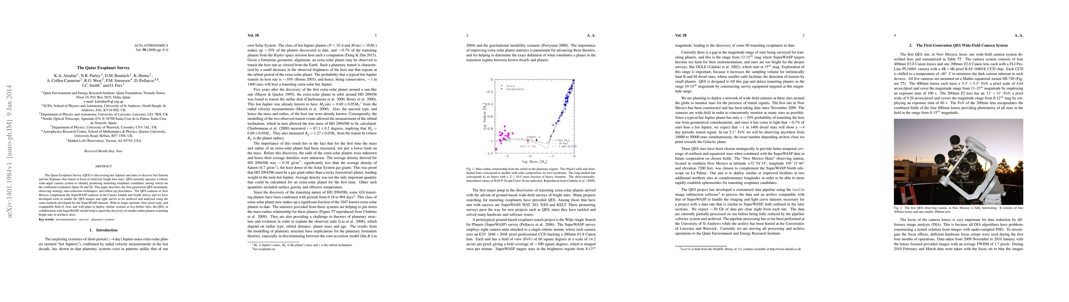 The Qatar Exoplanet Survey (QES) employs a robotic camera system to identify transiting hot Jupiters, hot Saturns, and hot Neptunes, with confirmed discoveries including Qatar 1b and 2b. The paper details the QES instrument, observing strategy, and data analysis techniques, aiming to enhance the discovery of smaller exoplanets in northern skies.
