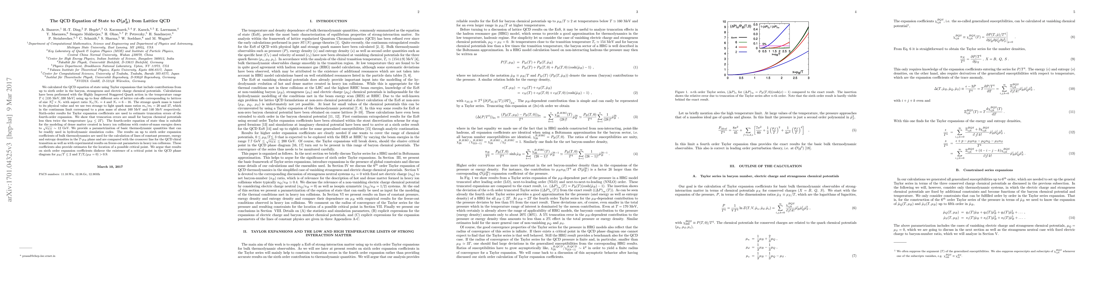 We calculated the QCD equation of state using Taylor expansions that include contributions from up to sixth order in the baryon, strangeness and electric charge chemical potentials. Calculations have been performed with the Highly Improved Staggered Quark action in the temperature range $T\in [135~{\rm MeV}, 330~{\rm MeV}]$ using up to four different sets of lattice cut-offs corresponding to lattices of size $N_\sigma^3\times N_\tau$ with aspect ratio $N_\sigma/N_\tau=4$ and $N_\tau =6-16$. The strange quark mass is tuned to its physical value and we use two strange to light quark mass ratios $m_s/m_l=20$ and $27$, which in the continuum limit correspond to a pion mass of about $160$ MeV and $140$ MeV espectively. Sixth-order results for Taylor expansion coefficients are used to estimate truncation errors of the fourth-order expansion. We show that truncation errors are small for baryon chemical potentials less then twice the temperature ($\mu_B\le 2T$). The fourth-order equation of state thus is suitable for the modeling of dense matter created in heavy ion collisions with center-of-mass energies down to $\sqrt{s_{NN}}\sim 12$ GeV. We provide a parametrization of basic thermodynamic quantities that can be readily used in hydrodynamic simulation codes. The results on up to sixth order expansion coefficients of bulk thermodynamics are used for the calculation of lines of constant pressure, energy and entropy densities in the $T$-$\mu_B$ plane and are compared with the crossover line for the QCD chiral transition as well as with experimental results on freeze-out parameters in heavy ion collisions. These coefficients also provide estimates for the location of a possible critical point. We argue that results on sixth order expansion coefficients disfavor the existence of a critical point in the QCD phase diagram for $\mu_B/T\le 2$ and $T/T_c(\mu_B=0) > 0.9$.