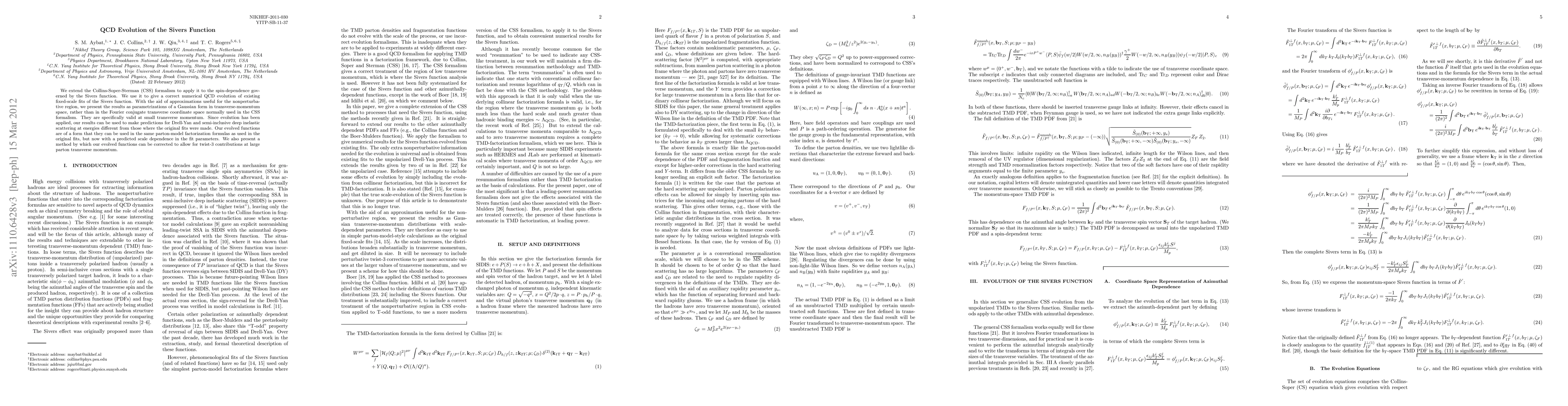 We extend the Collins-Soper-Sterman (CSS) formalism to apply it to the spin-dependence governed by the Sivers function. We use it to give a correct numerical QCD evolution of existing fixed-scale fits of the Sivers function. With the aid of approximations useful for the non-perturbative region, we present the results as parametrizations of a Gaussian form in transverse momentum space, rather than in the Fourier conjugate transverse coordinate space normally used in the CSS formalism. They are specifically valid at small transverse momentum. Since evolution has been applied, our results can be used to make predictions for Drell-Yan and semi-inclusive deep inelastic scattering at energies different from those where the original fits were made. Our evolved functions are of a form that they can be used in the same parton model factorization formulas as used in the original fits, but now with a predicted scale dependence in the fit parameters. We also present a method by which our evolved functions can be corrected to allow for twist-3 contributions at large parton transverse momentum.