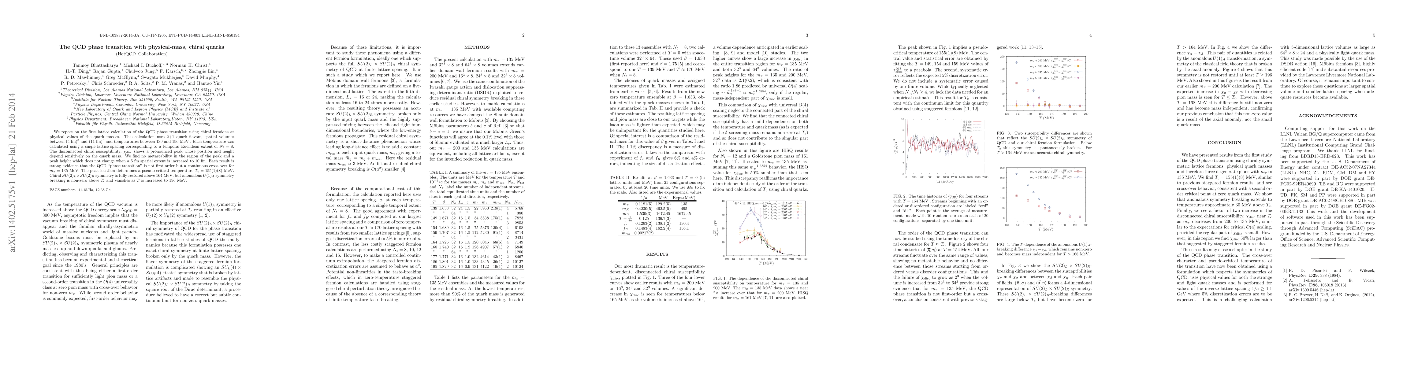 This study presents the first lattice QCD calculation of the phase transition using chiral fermions at physical quark masses, revealing a continuous crossover rather than a first-order transition. The peak in the disconnected chiral susceptibility indicates a pseudo-critical temperature of $T_c = 155(1)(8)$ MeV.