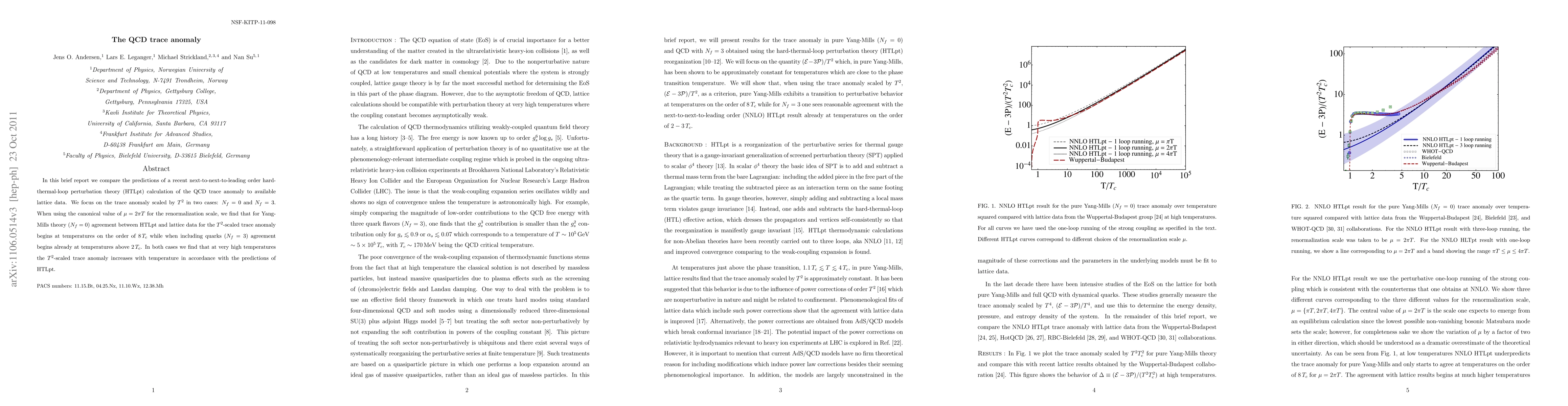 This paper compares next-to-next-to-leading order HTLpt calculations of the QCD trace anomaly with lattice data, finding that agreement starts at higher temperatures for Yang-Mills theory (N_f=0) around 8 T_c and for QCD with quarks (N_f=3) above 2 T_c, with both showing increasing T^2-scaled trace anomaly at very high temperatures.
