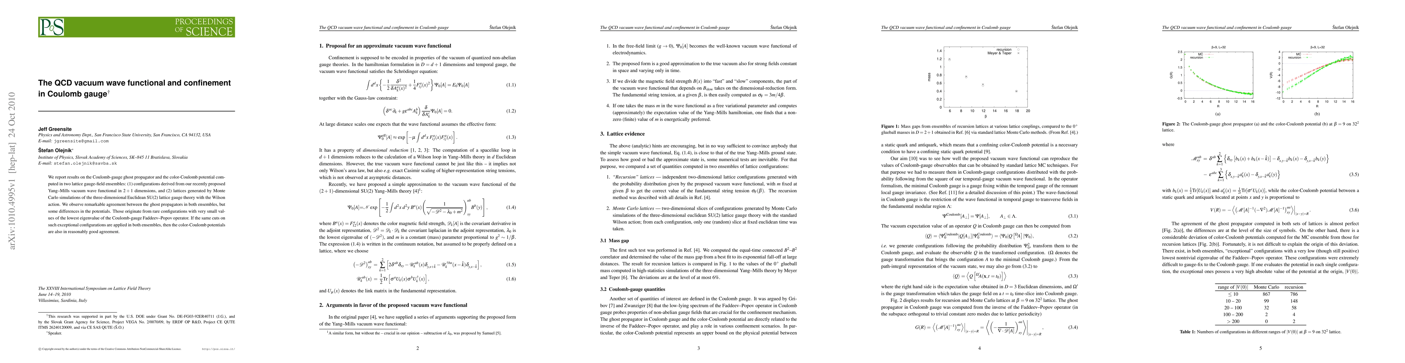 We report results on the Coulomb-gauge ghost propagator and the color-Coulomb potential computed in two lattice gauge-field ensembles: (1) configurations derived from our recently proposed Yang-Mills vacuum wave functional in 2+1 dimensions, and (2) lattices generated by Monte Carlo simulations of the three-dimensional Euclidean SU(2) lattice gauge theory with the Wilson action. We observe remarkable agreement between the ghost propagators in both ensembles, but some differences in the potentials. Those originate from rare configurations with very small values of the lowest eigenvalue of the Coulomb-gauge Faddeev-Popov operator. If the same cuts on such exceptional configurations are applied in both ensembles, then the color-Coulomb potentials are also in reasonably good agreement.