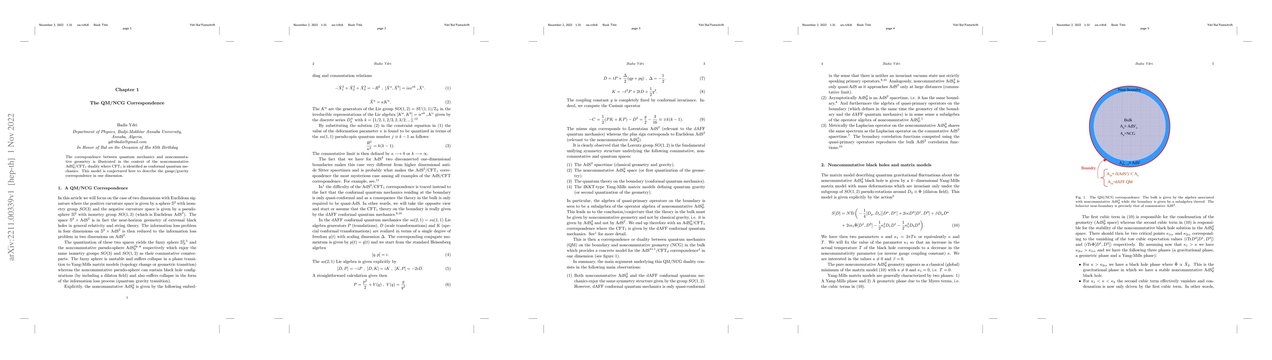 The paper explores the relationship between quantum mechanics and noncommutative geometry through the ${\rm AdS}^2_{\theta}/{\rm CFT}_1$ duality, identifying ${\rm CFT}_1$ as conformal quantum mechanics, and discusses its implications for gauge/gravity correspondence, quantum black holes, and emergent geometry/gravity.