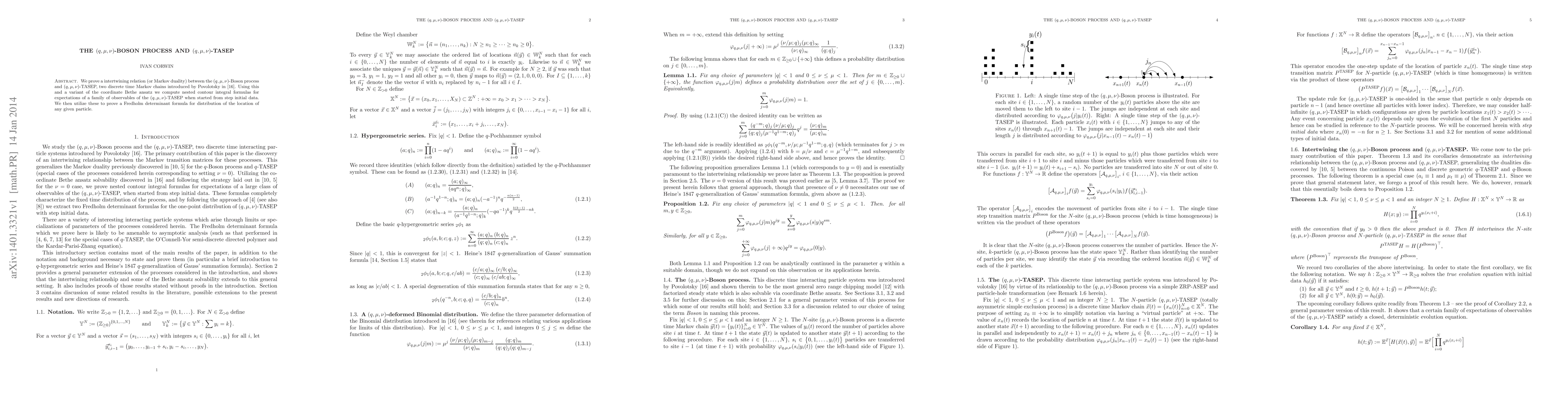 This paper establishes an intertwining relation between the $(q,\mu,\nu)$-Boson process and $(q,\mu,\nu)$-TASEP, two discrete time Markov chains. It employs a variant of the coordinate Bethe ansatz to derive nested contour integral formulas for expectations of observables in $(q,\mu,\nu)$-TASEP, leading to a Fredholm determinant formula for the distribution of a particle's location.