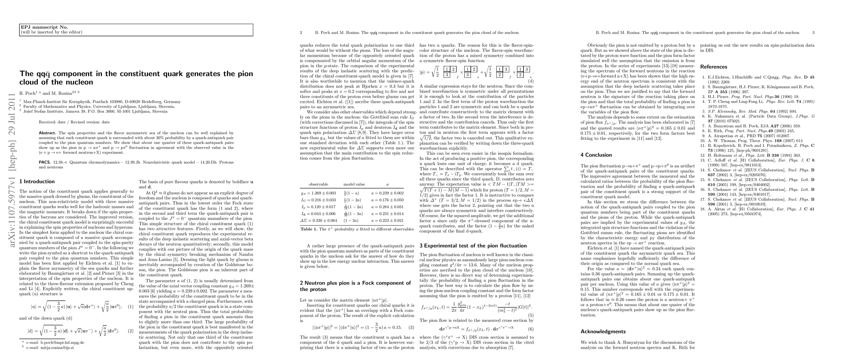 The spin properties and the flavor asymmetric sea of the nucleon can be well explained by assuming that each constituent quark is surrounded with about 30% probability by a quark-antiquark pair coupled to the pion quantum numbers. We show that about one quarter of these quark-antiquark pairs show up as the pion in $\p\to\n\pi^+$ and $\p\to\p\pi^0$ fluctuation in agreement with the observed value in the ($\e+\p\to\e+$ forward neutron+X) experiment.