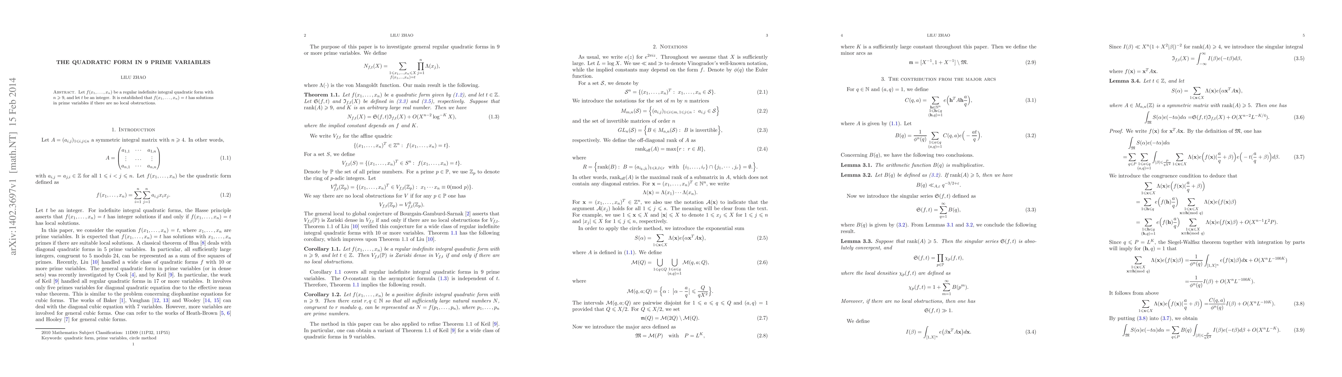 Summary: This paper proves that a regular indefinite integral quadratic form with at least 9 prime variables can equal an integer $t$ if there are no local obstructions, ensuring solutions exist in prime variables.