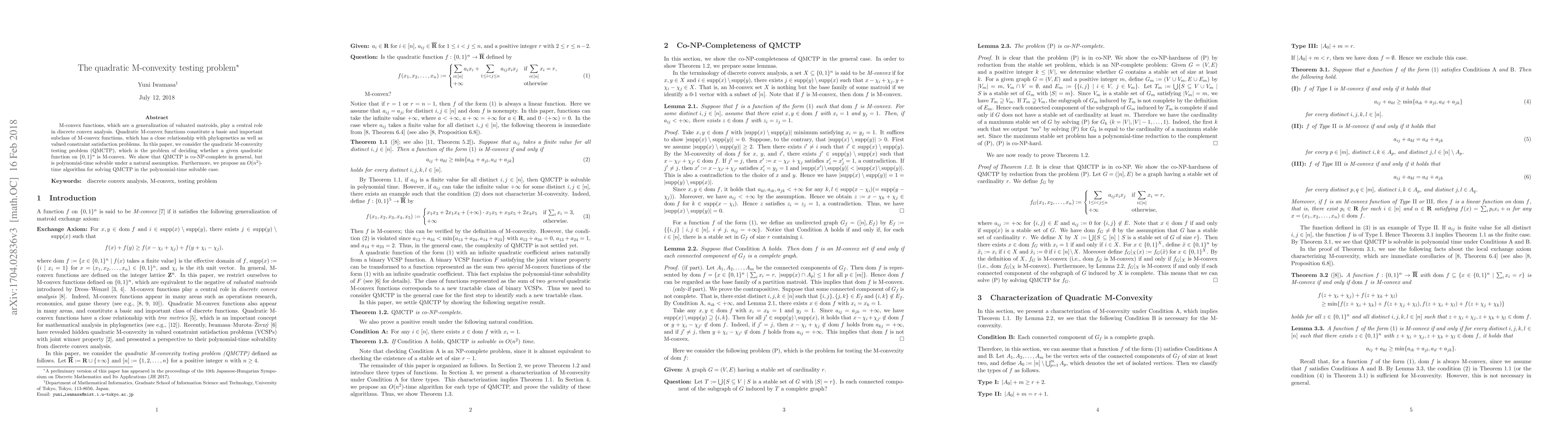 M-convex functions, which are a generalization of valuated matroids, play a central role in discrete convex analysis. Quadratic M-convex functions constitute a basic and important subclass of M-convex functions, which has a close relationship with phylogenetics as well as valued constraint satisfaction problems. In this paper, we consider the quadratic M-convexity testing problem (QMCTP), which is the problem of deciding whether a given quadratic function on $\{0,1\}^n$ is M-convex. We show that QMCTP is co-NP-complete in general, but is polynomial-time solvable under a natural assumption. Furthermore, we propose an $O(n^2)$-time algorithm for solving QMCTP in the polynomial-time solvable case.