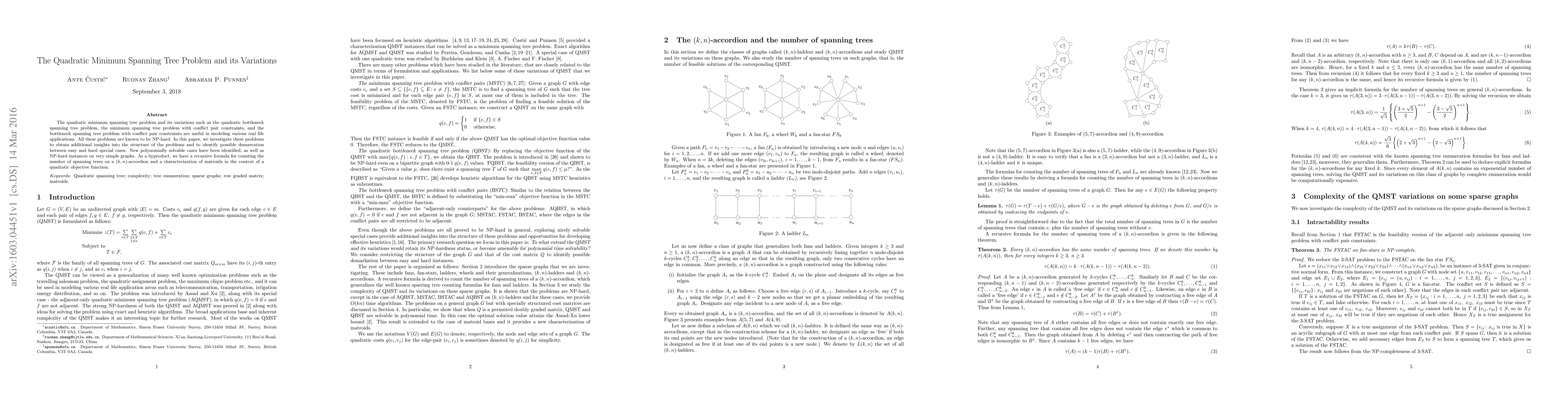 This paper explores the quadratic minimum spanning tree problem and its variations, revealing new polynomially solvable cases and NP-hard instances, while also providing a recursive formula for counting spanning trees on $(k,n)$-accordions and characterizing matroids under quadratic objectives.