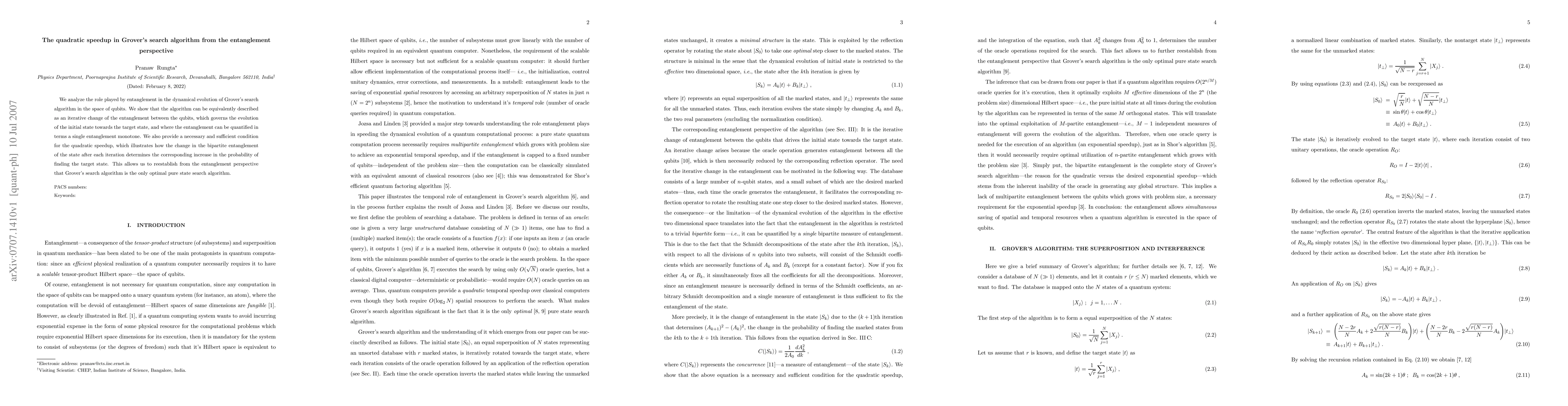 This paper analyzes Grover's search algorithm through the lens of entanglement, demonstrating that the quadratic speedup arises from the iterative change in entanglement between qubits. It establishes a condition for this speedup based on the bipartite entanglement, reaffirming Grover's algorithm as the optimal pure state search method.