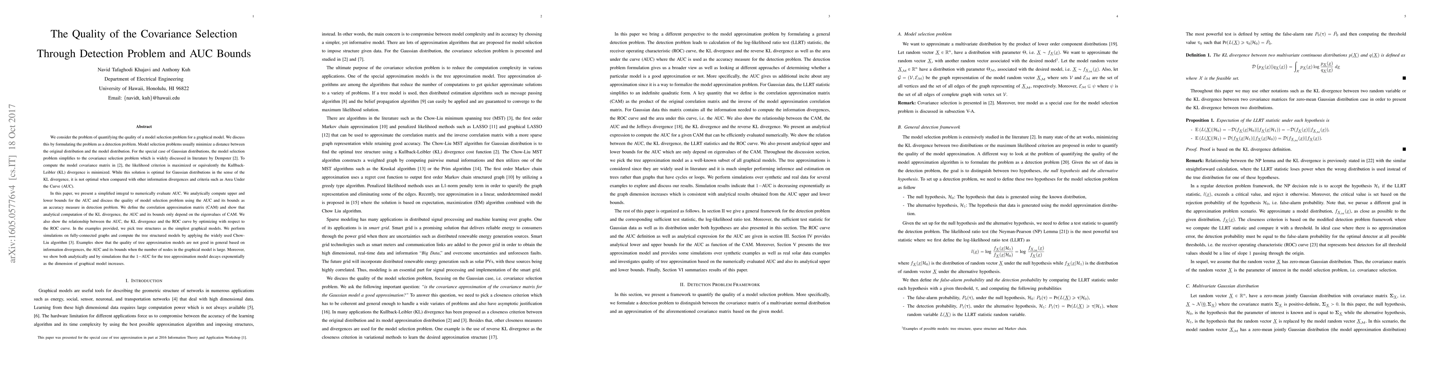 We consider the problem of quantifying the quality of a model selection problem for a graphical model. We discuss this by formulating the problem as a detection problem. Model selection problems usually minimize a distance between the original distribution and the model distribution. For the special case of Gaussian distributions, the model selection problem simplifies to the covariance selection problem which is widely discussed in literature by Dempster [2] where the likelihood criterion is maximized or equivalently the Kullback-Leibler (KL) divergence is minimized to compute the model covariance matrix. While this solution is optimal for Gaussian distributions in the sense of the KL divergence, it is not optimal when compared with other information divergences and criteria such as Area Under the Curve (AUC). In this paper, we analytically compute upper and lower bounds for the AUC and discuss the quality of model selection problem using the AUC and its bounds as an accuracy measure in detection problem. We define the correlation approximation matrix (CAM) and show that analytical computation of the KL divergence, the AUC and its bounds only depend on the eigenvalues of CAM. We also show the relationship between the AUC, the KL divergence and the ROC curve by optimizing with respect to the ROC curve. In the examples provided, we pick tree structures as the simplest graphical models. We perform simulations on fully-connected graphs and compute the tree structured models by applying the widely used Chow-Liu algorithm [3]. Examples show that the quality of tree approximation models are not good in general based on information divergences, the AUC and its bounds when the number of nodes in the graphical model is large. We show both analytically and by simulations that the 1-AUC for the tree approximation model decays exponentially as the dimension of graphical model increases.