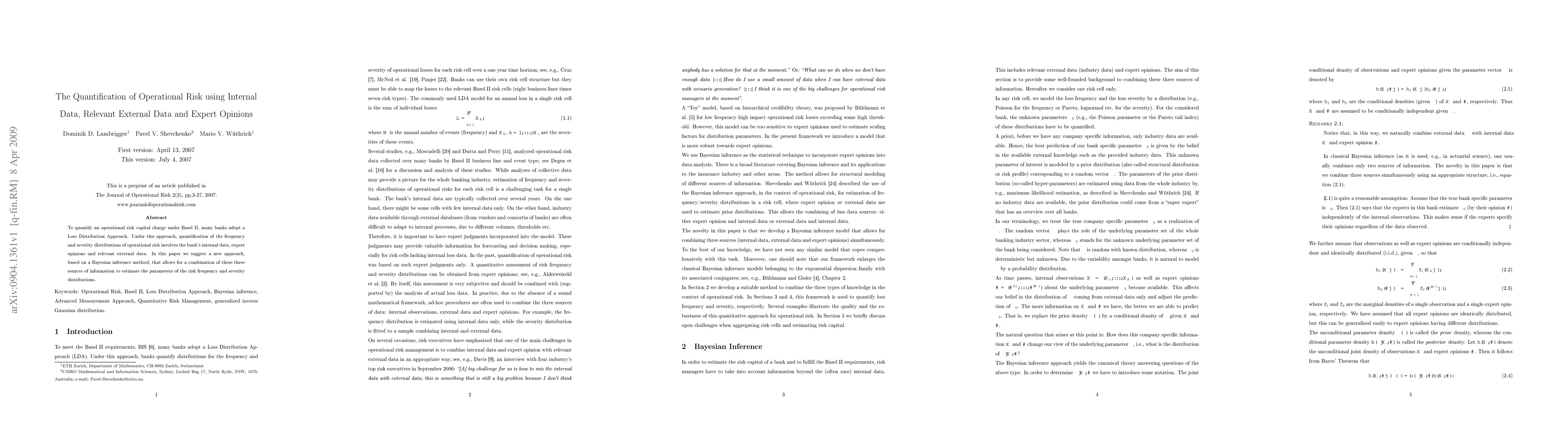 This paper proposes a Bayesian inference method to quantify operational risk capital charges by integrating internal data, relevant external data, and expert opinions to estimate the frequency and severity distributions under Basel II's Loss Distribution Approach.