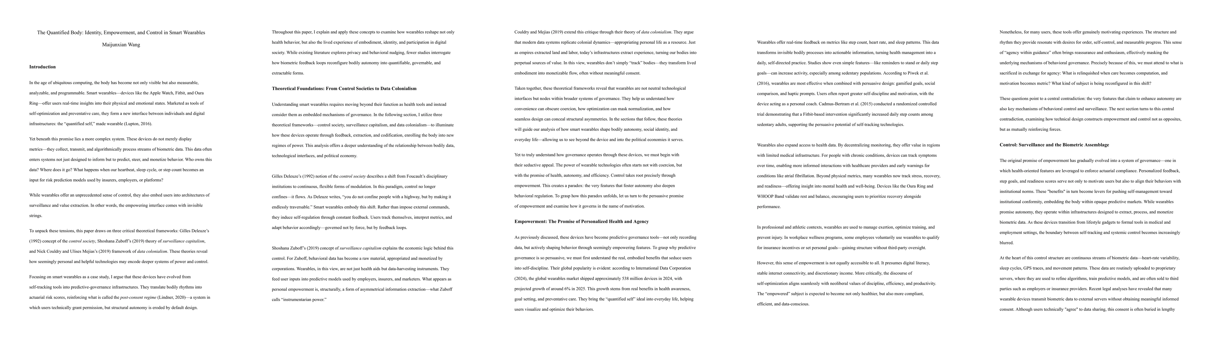In an era where the body is increasingly translated into streams of biometric data, smart wearables have become not merely tools of personal health tracking but infrastructures of predictive governance. This paper examines how wearable technologies reconfigure bodily autonomy by embedding users within feedback-driven systems of self-surveillance, data extraction, and algorithmic control. Drawing on Deleuze's concept of the control society, Zuboff's theory of surveillance capitalism, and Couldry and Mejias's notion of data colonialism, I argue that smart wearables shift the discourse of health empowerment toward a modality of compliance aligned with neoliberal values of productivity, efficiency, and self-discipline. Rather than offering transparent consent, these technologies operate within what scholars describe as a post-consent regime -- where asymmetrical data relations are normalized through seamless design and behavioral nudging. Through interdisciplinary analysis, the paper further explores alternative trajectories for wearable design and governance, from historical examples of care-centered devices to contemporary anti-extractive practices and collective data justice frameworks. Ultimately, it calls for a paradigm shift from individual optimization to democratic accountability and structural reform in the governance of bodily data.