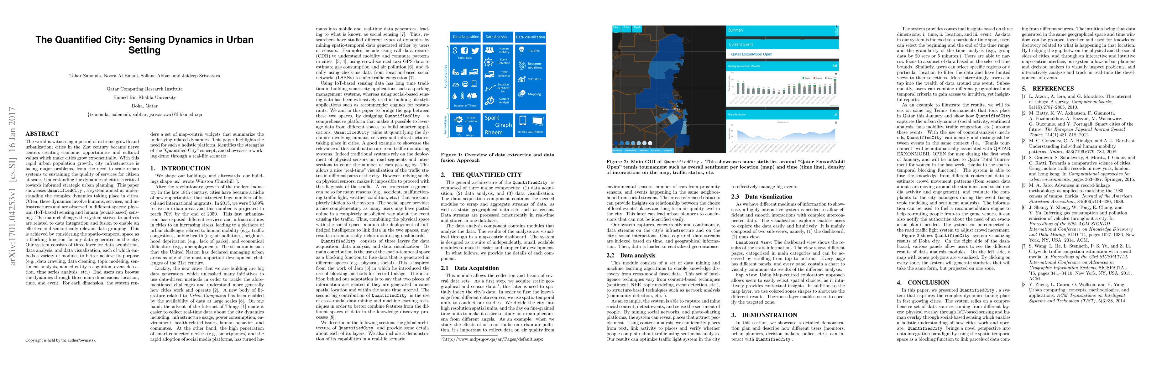 The world is witnessing a period of extreme growth and urbanization; cities in the 21st century became nerve centers creating economic opportunities and cultural values which make cities grow exponentially. With this rapid urban population growth, city infrastructure is facing major problems, from the need to scale urban systems to sustaining the quality of services for citizen at scale. Understanding the dynamics of cities is critical towards informed strategic urban planning. This paper showcases QuantifiedCity, a system aimed at understanding the complex dynamics taking place in cities. Often, these dynamics involve humans, services, and infrastructures and are observed in different spaces: physical (IoT-based) sensing and human (social-based) sensing. The main challenges the system strives to address are related to data integration and fusion to enable an effective and semantically relevant data grouping. This is achieved by considering the spatio-temporal space as a blocking function for any data generated in the city. Our system consists of three layer for data acquisition, data analysis, and data visualization; each of which embeds a variety of modules to better achieve its purpose (e.g., data crawling, data cleaning, topic modeling, sentiment analysis, named entity recognition, event detection, time series analysis, etc.) End users can browse the dynamics through three main dimensions: location, time, and event. For each dimension, the system renders a set of map-centric widgets that summarize the underlying related dynamics. This paper highlights the need for such a holistic platform, identifies the strengths of the "Quantified City" concept, and showcases a working demo through a real-life scenario.