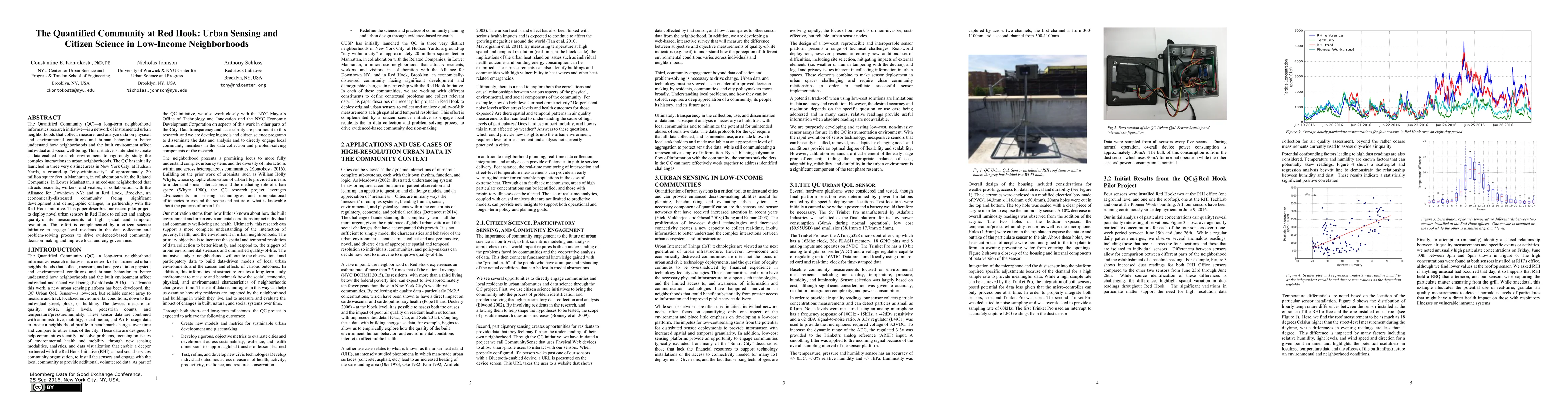 The Quantified Community initiative deploys urban sensors in Red Hook, Brooklyn, to gather high-resolution data on physical and environmental conditions, complemented by a citizen science project engaging residents to enhance local governance and decision-making.