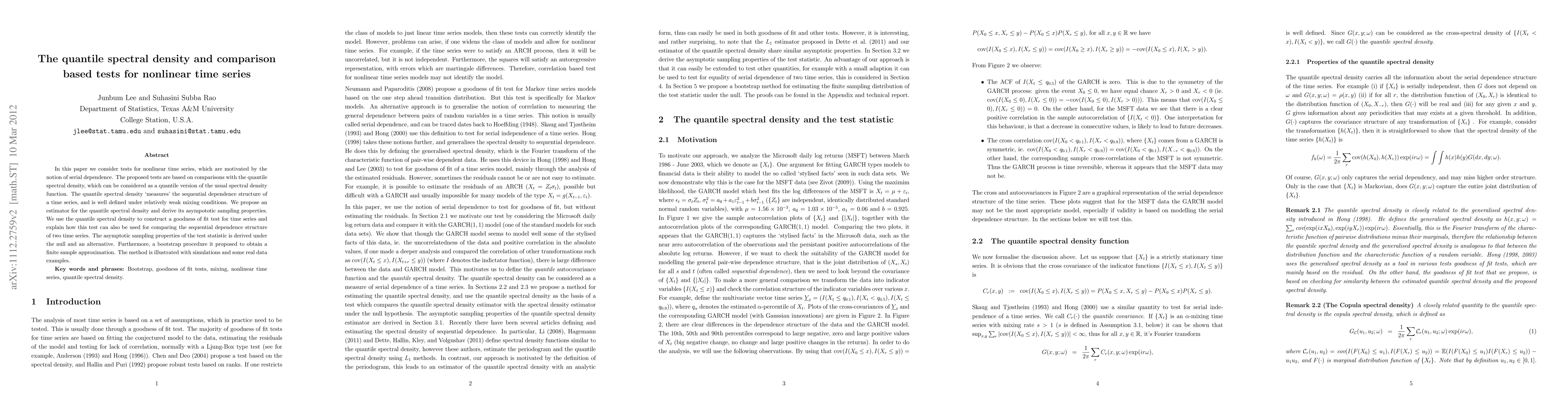 This paper proposes tests for nonlinear time series based on the quantile spectral density, which measures sequential dependence structure under weak mixing conditions. The authors develop an estimator and its asymptotic properties, and use it to construct a goodness of fit test and a comparison test for the sequential dependence of two time series, illustrated with simulations and real data.