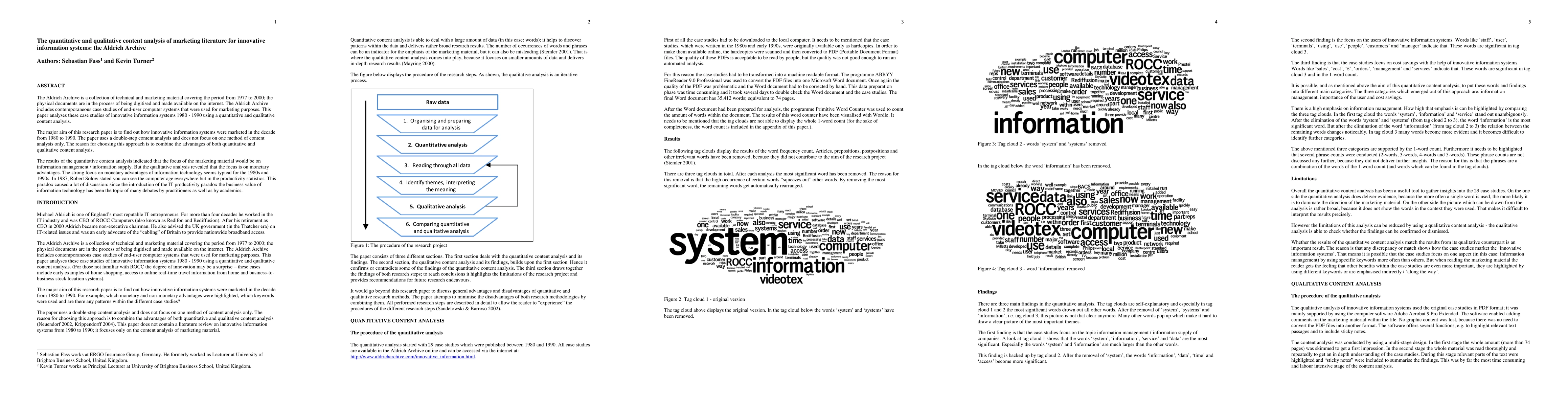 The Aldrich Archive is a collection of technical and marketing material covering the period from 1977 to 2000; the physical documents are in the process of being digitised and made available on the internet. The Aldrich Archive includes contemporaneous case studies of end-user computer systems that were used for marketing purposes. This paper analyses these case studies of innovative information systems 1980 - 1990 using a quantitative and qualitative content analysis. The major aim of this research paper is to find out how innovative information systems were marketed in the decade from 1980 to 1990. The paper uses a double-step content analysis and does not focus on one method of content analysis only. The reason for choosing this approach is to combine the advantages of both quantitative and qualitative content analysis. The results of the quantitative content analysis indicated that the focus of the marketing material would be on information management / information supply. But the qualitative analysis revealed that the focus is on monetary advantages. The strong focus on monetary advantages of information technology seems typical for the 1980s and 1990s. In 1987, Robert Solow stated you can see the computer age everywhere but in the productivity statistics. This paradox caused a lot of discussion: since the introduction of the IT productivity paradox the business value of information technology has been the topic of many debates by practitioners as well as by academics.
